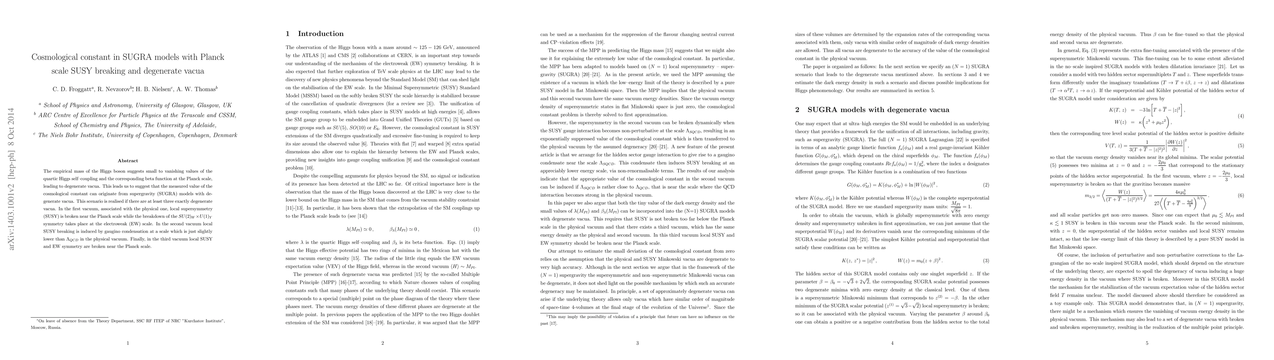 This paper explores cosmological constant origins in SUGRA models with Planck scale SUSY breaking and degenerate vacua, suggesting the measured value arises from at least three exactly degenerate vacua, with distinct SUSY breaking mechanisms in each. Empirical Higgs data indicate small Higgs self-couplings, pointing to degenerate vacua scenarios where SUSY is broken near the Planck scale in one vacuum and at the EW scale in another.