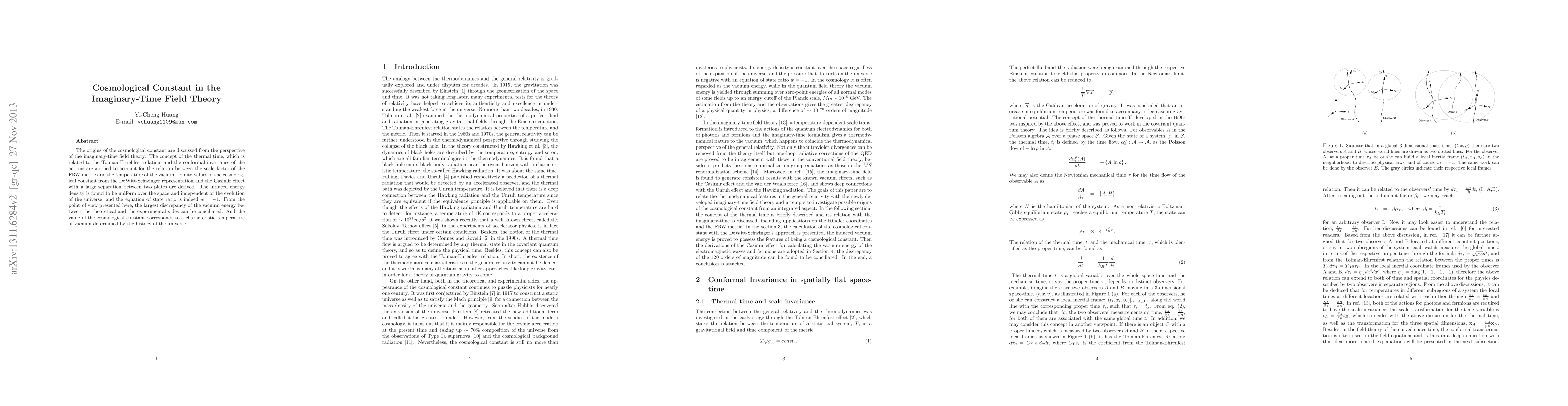 This paper explores the cosmological constant through imaginary-time field theory, linking thermal time and conformal invariance to derive a finite value. It reconciles the discrepancy between theoretical predictions and experimental observations, proposing that the cosmological constant corresponds to a vacuum energy characteristic temperature.