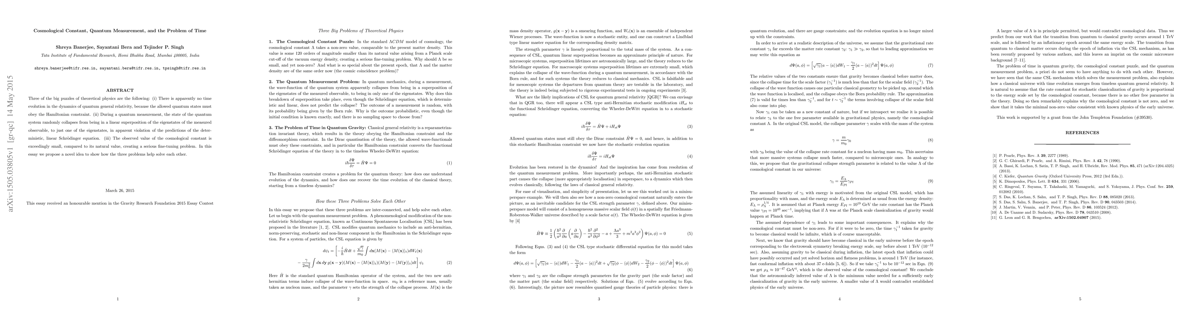 Three of the big puzzles of theoretical physics are the following: (i) There is apparently no time evolution in the dynamics of quantum general relativity, because the allowed quantum states must obey the Hamiltonian constraint. (ii) During a quantum measurement, the state of the quantum system randomly collapses from being in a linear superposition of the eigenstates of the measured observable, to just one of the eigenstates, in apparent violation of the predictions of the deterministic, linear Schr\"{o}dinger equation. (iii) The observed value of the cosmological constant is exceedingly small, compared to its natural value, creating a serious fine-tuning problem. In this essay we propose a novel idea to show how the three problems help solve each other.