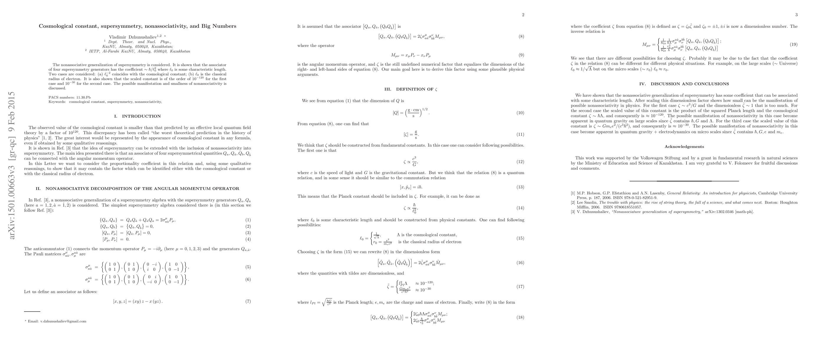 The nonassociative generalization of supersymmetry is considered. It is shown that the associator of four supersymmetry generators has the coefficient $\sim \hbar/ \ell_0^2$ where $\ell_0$ is some characteristic length. Two cases are considered: (a) $\ell_0^{-2}$ coincides with the cosmological constant; (b) $\ell_0$ is the classical radius of electron. It is also shown that the scaled constant is of the order of $10^{-120}$ for the first case and $10^{-30}$ for the second case. The possible manifestation and smallness of nonassociativity is discussed.