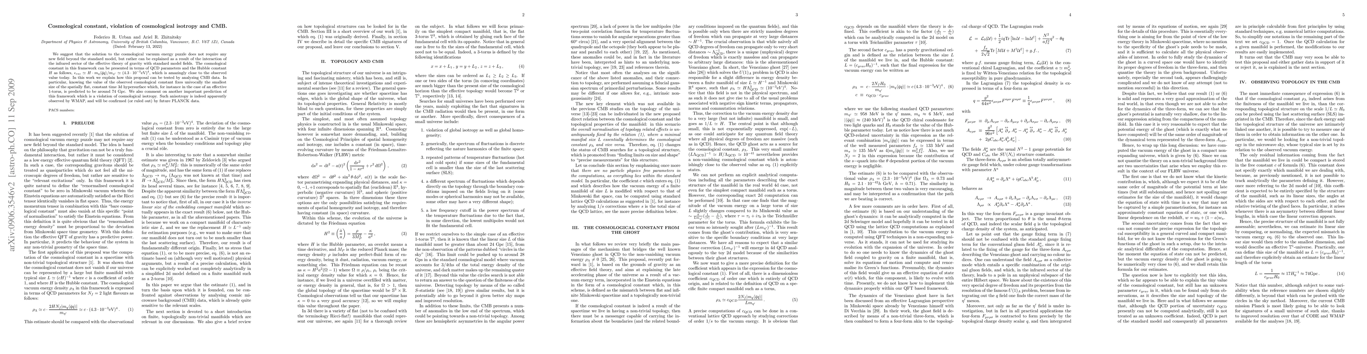 We suggest that the solution to the cosmological vacuum energy puzzle does not require any new field beyond the standard model, but rather can be explained as a result of the interaction of the infrared sector of the effective theory of gravity with standard model fields. The cosmological constant in this framework can be presented in terms of QCD parameters and the Hubble constant $H$ as follows, $\epsilon_{vac} \sim H \cdot m_q\la\bar{q}q\ra /m_{\eta'} \sim (4.3\cdot 10^{-3} \text{eV})^4$, which is amazingly close to the observed value today. In this work we explain how this proposal can be tested by analyzing CMB data. In particular, knowing the value of the observed cosmological constant fixes univocally the smallest size of the spatially flat, constant time 3d hypersurface which, for instance in the case of an effective 1-torus, is predicted to be around 74 Gpc. We also comment on another important prediction of this framework which is a violation of cosmological isotropy. Such anisotropy is indeed apparently observed by WMAP, and will be confirmed (or ruled out) by future PLANCK data.