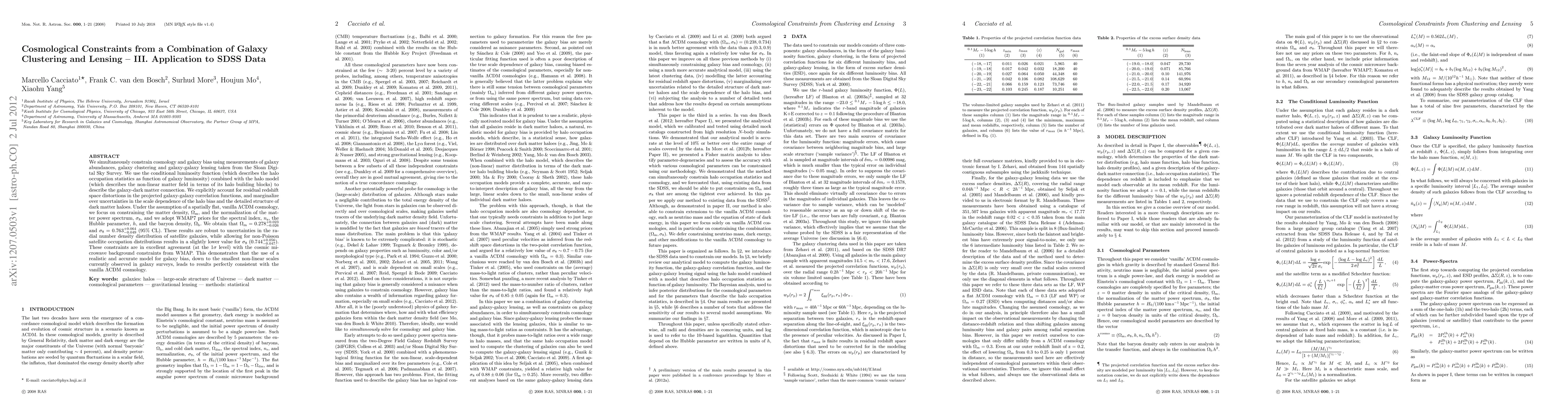 We simultaneously constrain cosmology and galaxy bias using measurements of galaxy abundances, galaxy clustering and galaxy-galaxy lensing taken from the Sloan Digital Sky Survey. We use the conditional luminosity function (which describes the halo occupation statistics as function of galaxy luminosity) combined with the halo model (which describes the non-linear matter field in terms of its halo building blocks) to describe the galaxy-dark matter connection. We explicitly account for residual redshift space distortions in the projected galaxy-galaxy correlation functions, and marginalize over uncertainties in the scale dependence of the halo bias and the detailed structure of dark matter haloes. Under the assumption of a spatially flat, vanilla {\Lambda}CDM cosmology, we focus on constraining the matter density, {\Omega}m, and the normalization of the matter power spectrum, {\sigma}8, and we adopt WMAP7 priors for the spectral index, the Hubble parameter, and the baryon density. We obtain that \Omegam = 0.278_{-0.026}^{+0.023} and {\sigma}8 = 0.763_{-0.049}^{+0.064} (95% CL). These results are robust to uncertainties in the radial number density distribution of satellite galaxies, while allowing for non-Poisson satellite occupation distributions results in a slightly lower value for {\sigma}8 (0.744_{-0.047}^{+0.056}). These constraints are in excellent agreement (at the 1{\sigma} level) with the cosmic microwave background constraints from WMAP. This demonstrates that the use of a realistic and accurate model for galaxy bias, down to the smallest non-linear scales currently observed in galaxy surveys, leads to results perfectly consistent with the vanilla {\Lambda}CDM cosmology.