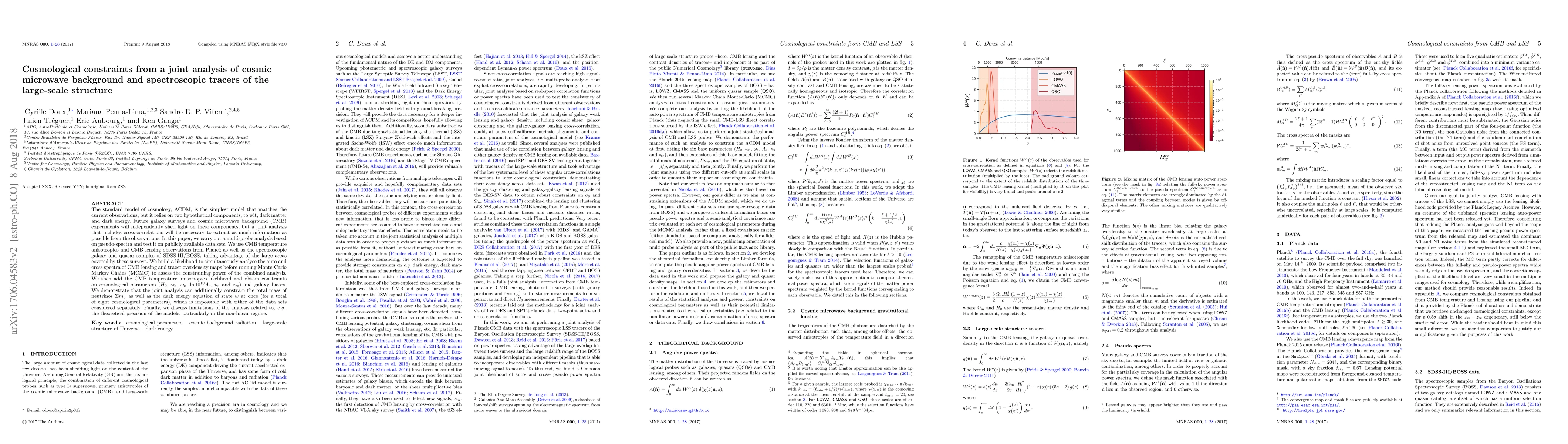 This paper conducts a joint analysis of cosmic microwave background (CMB) and large-scale structure data to constrain cosmological parameters, including dark matter, dark energy, and neutrino mass. The study combines CMB temperature anisotropies and lensing from Planck with galaxy and quasar data from SDSS-III/BOSS, demonstrating improved constraints on eight parameters compared to separate analyses.