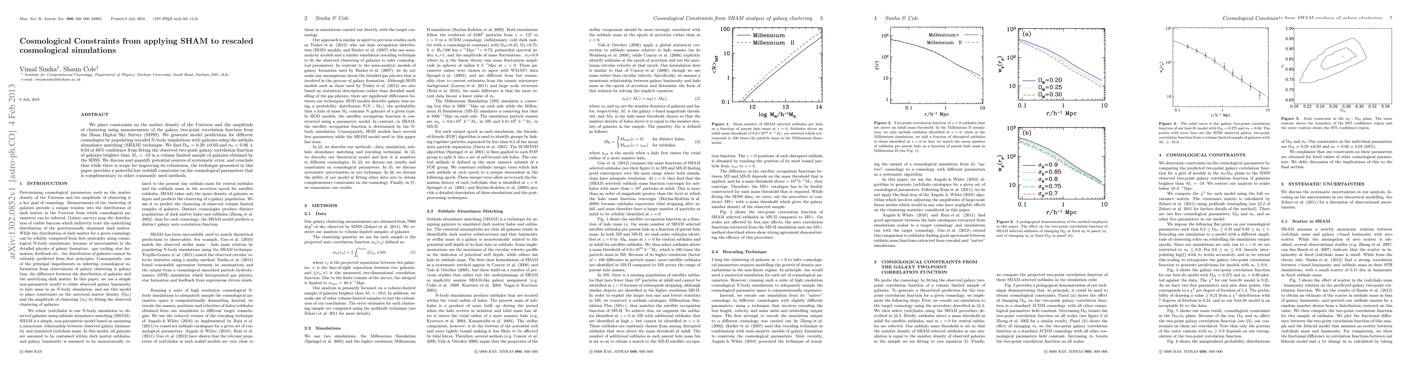 This paper uses the subhalo abundance matching (SHAM) technique on rescaled N-body simulations to constrain cosmological parameters, finding Omega-M = 0.29 +/- 0.03 and sigma-8 = 0.86 +/- 0.04. The analysis, based on SDSS galaxy data, provides a robust low-redshift constraint on the matter density and clustering amplitude, complementing other methods.