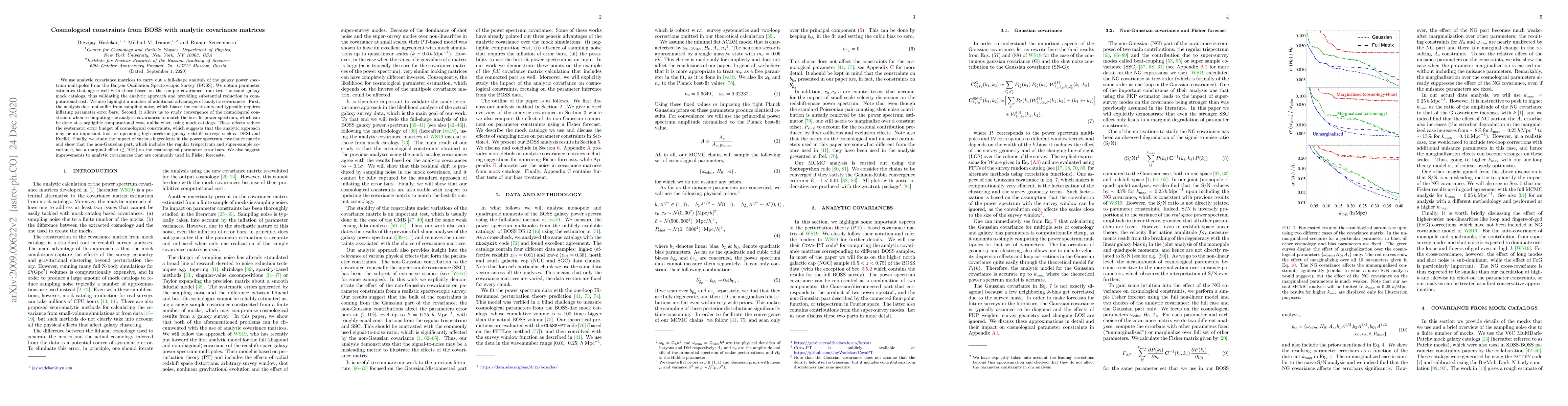 We use analytic covariance matrices to carry out a full-shape analysis of the galaxy power spectrum multipoles from the Baryon Oscillation Spectroscopic Survey (BOSS). We obtain parameter estimates that agree well with those based on the sample covariance from two thousand galaxy mock catalogs, thus validating the analytic approach and providing substantial reduction in computational cost. We also highlight a number of additional advantages of analytic covariances. First, the analysis does not suffer from sampling noise, which biases the constraints and typically requires inflating parameter error bars. Second, it allows us to study convergence of the cosmological constraints when recomputing the analytic covariances to match the best-fit power spectrum, which can be done at a negligible computational cost, unlike when using mock catalogs. These effects reduce the systematic error budget of cosmological constraints, which suggests that the analytic approach may be an important tool for upcoming high-precision galaxy redshift surveys such as DESI and Euclid. Finally, we study the impact of various ingredients in the power spectrum covariance matrix and show that the non-Gaussian part, which includes the regular trispectrum and super-sample covariance, has a marginal effect ($\lesssim 10 \%$) on the cosmological parameter error bars. We also suggest improvements to analytic covariances that are commonly used in Fisher forecasts.
