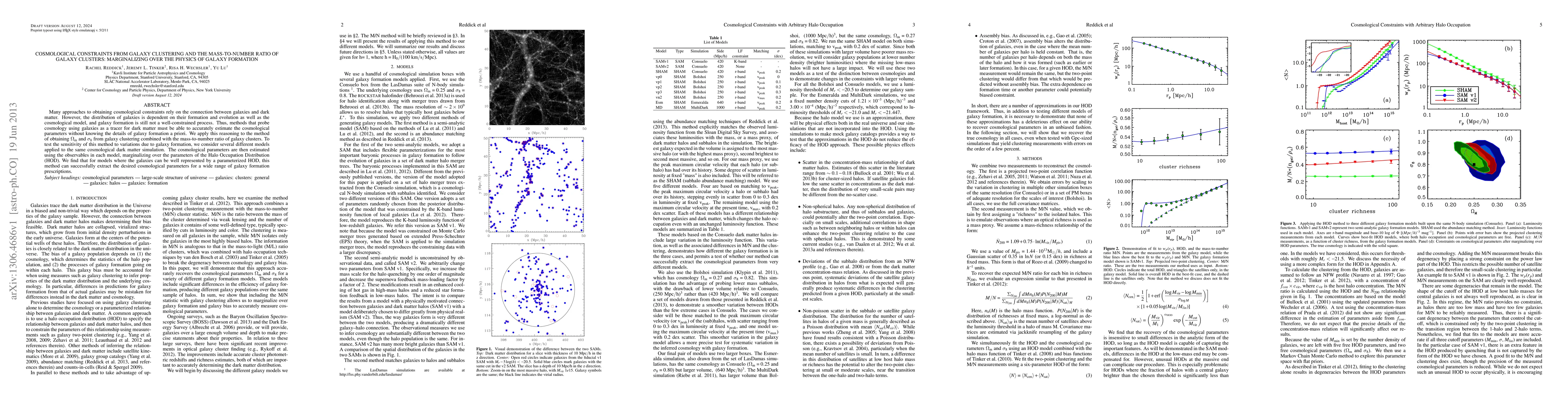 This paper explores cosmological constraints from galaxy clustering and the mass-to-number ratio of galaxy clusters, demonstrating that the method can accurately estimate $\Omega_m$ and $\sigma_8$ while marginalizing over galaxy formation physics. The study finds that the method is robust across various galaxy formation models when galaxies are well represented by a parameterized Halo Occupation Distribution.