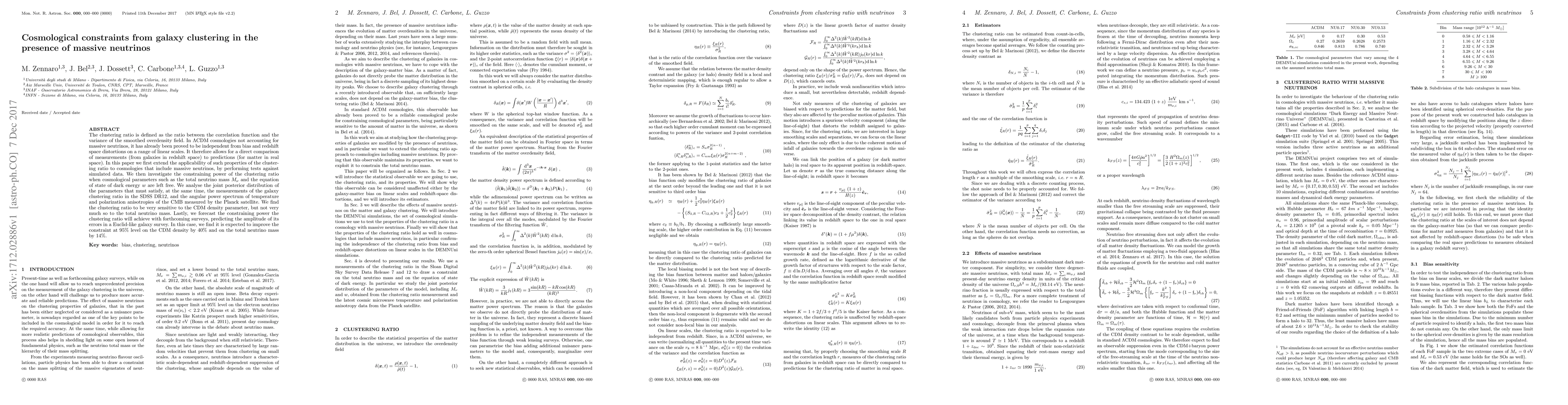 The clustering ratio is defined as the ratio between the correlation function and the variance of the smoothed overdensity field. In LCDM cosmologies not accounting for massive neutrinos, it has already been proved to be independent from bias and redshift space distortions on a range of linear scales. It therefore allows for a direct comparison of measurements (from galaxies in redshift space) to predictions (for matter in real space). In this paper we first extend the applicability of such properties of the clustering ratio to cosmologies that include massive neutrinos, by performing tests against simulated data. We then investigate the constraining power of the clustering ratio when cosmological parameters such as the total neutrino mass and the equation of state of dark energy are left free. We analyse the joint posterior distribution of the parameters that must satisfy, at the same time, the measurements of the galaxy clustering ratio in the SDSS DR12, and the angular power spectrum of temperature and polarization anisotropies of the CMB measured by the Planck satellite. We find the clustering ratio to be very sensitive to the CDM density parameter, but not very much so to the total neutrino mass. Lastly, we forecast the constraining power the clustering ratio will achieve with forthcoming surveys, predicting the amplitude of its errors in a Euclid-like galaxy survey. In this case, we find it is expected to improve the constraint at 95% level on the CDM density by 40% and on the total neutrino mass by 14%.