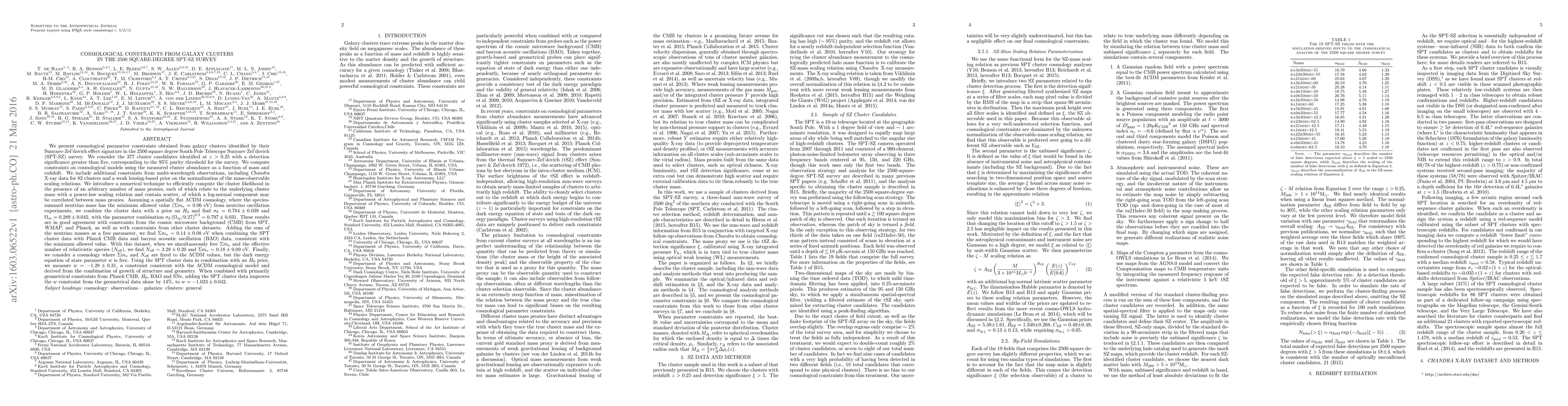 This paper derives cosmological constraints from galaxy clusters identified via the Sunyaev-Zel'dovich effect in the South Pole Telescope survey. The analysis yields parameters such as sigma_8 and Omega_m, consistent with CMB and other cluster datasets, and provides a constraint on the dark energy equation of state parameter w.