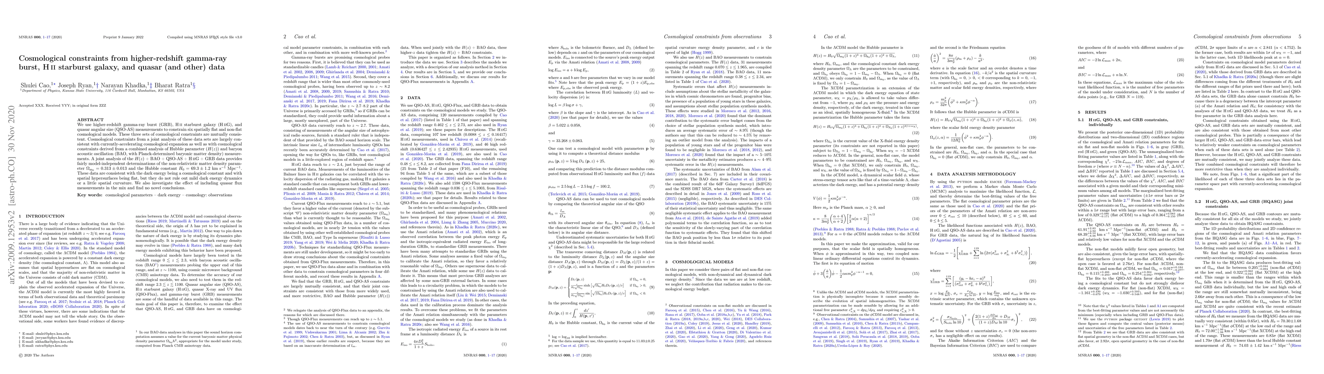 We use higher-redshift gamma-ray burst (GRB), HII starburst galaxy (HIIG), and quasar angular size (QSO-AS) measurements to constrain six spatially flat and non-flat cosmological models. These three sets of cosmological constraints are mutually consistent. Cosmological constraints from a joint analysis of these data sets are largely consistent with currently-accelerating cosmological expansion as well as with cosmological constraints derived from a combined analysis of Hubble parameter ($H(z)$) and baryon acoustic oscillation (BAO, with Planck-determined baryonic matter density) measurements. A joint analysis of the $H(z)$ + BAO + QSO-AS + HIIG + GRB data provides fairly model-independent determinations of the non-relativistic matter density parameter $\Omega_{\rm m_0}=0.313\pm0.013$ and the Hubble constant $H_0=69.3\pm1.2\ \rm{km \ s^{-1} \ Mpc^{-1}}$. These data are consistent with the dark energy being a cosmological constant and with spatial hypersurfaces being flat, but they do not rule out mild dark energy dynamics or a little spatial curvature. We also investigate the effect of including quasar flux measurements in the mix and find no novel conclusions.