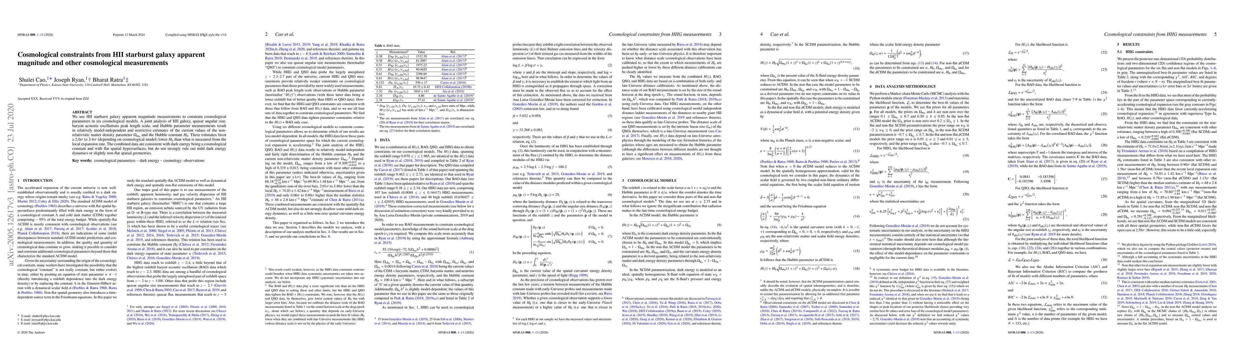 This paper uses HII starburst galaxy apparent magnitudes and other cosmological measurements to constrain parameters in six cosmological models, finding a lower Hubble constant $H_0$ than local measurements and supporting a cosmological constant model for dark energy, though it allows for mild dark energy dynamics and slight spatial curvature.