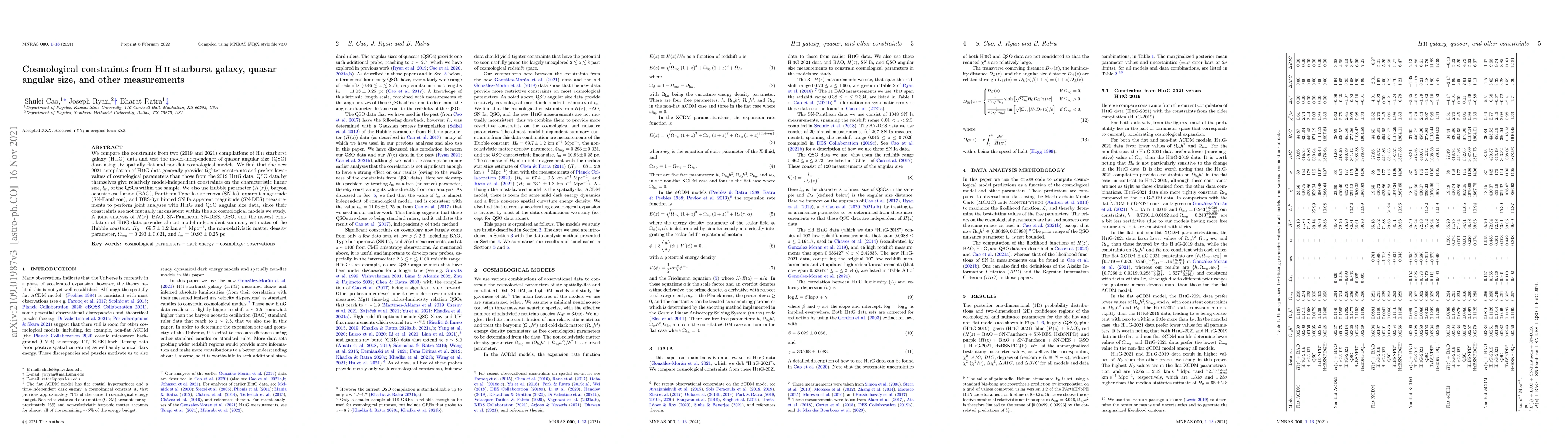 This paper compares cosmological constraints from updated HII starburst galaxy data and quasar angular size measurements, finding tighter constraints from the newer data. It also demonstrates that quasar angular size data provides model-independent constraints on quasar sizes, and a joint analysis with various cosmological measurements yields estimates for the Hubble constant, matter density parameter, and quasar size.