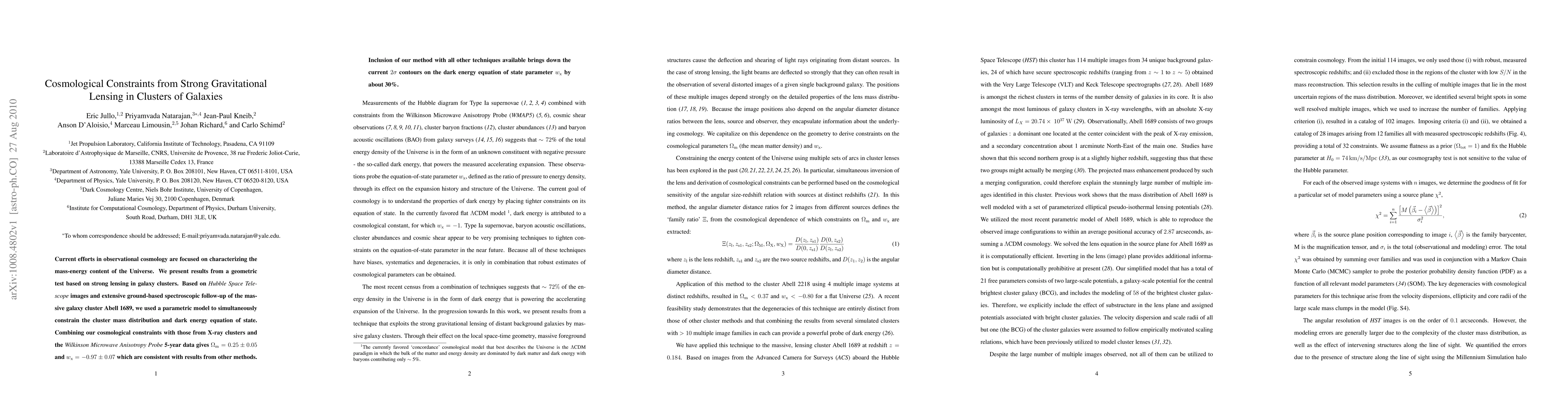 This paper uses strong gravitational lensing in galaxy cluster Abell 1689 to provide new cosmological constraints, finding Ωm = 0.25 ± 0.05 and wx = -0.97 ± 0.07, which are consistent with other methods. Combining this with other data reduces uncertainties in the dark energy equation of state by about 30%.