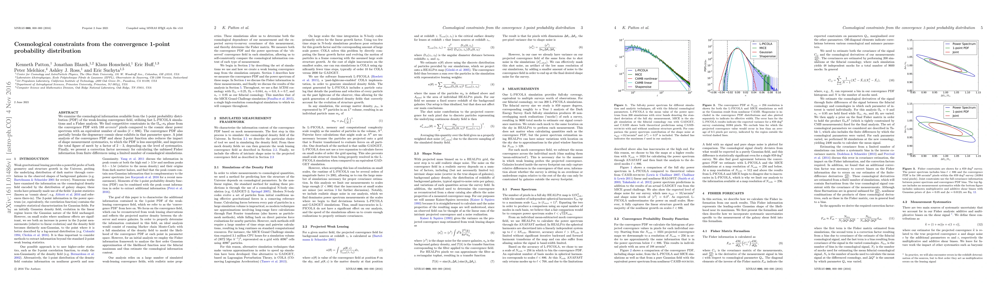 We examine the cosmological information available from the 1-point probability distribution (PDF) of the weak-lensing convergence field, utilizing fast L-PICOLA simulations and a Fisher analysis. We find competitive constraints in the $\Omega_m$-$\sigma_8$ plane from the convergence PDF with $188\ arcmin^2$ pixels compared to the cosmic shear power spectrum with an equivalent number of modes ($\ell < 886$). The convergence PDF also partially breaks the degeneracy cosmic shear exhibits in that parameter space. A joint analysis of the convergence PDF and shear 2-point function also reduces the impact of shape measurement systematics, to which the PDF is less susceptible, and improves the total figure of merit by a factor of $2-3$, depending on the level of systematics. Finally, we present a correction factor necessary for calculating the unbiased Fisher information from finite differences using a limited number of cosmological simulations.