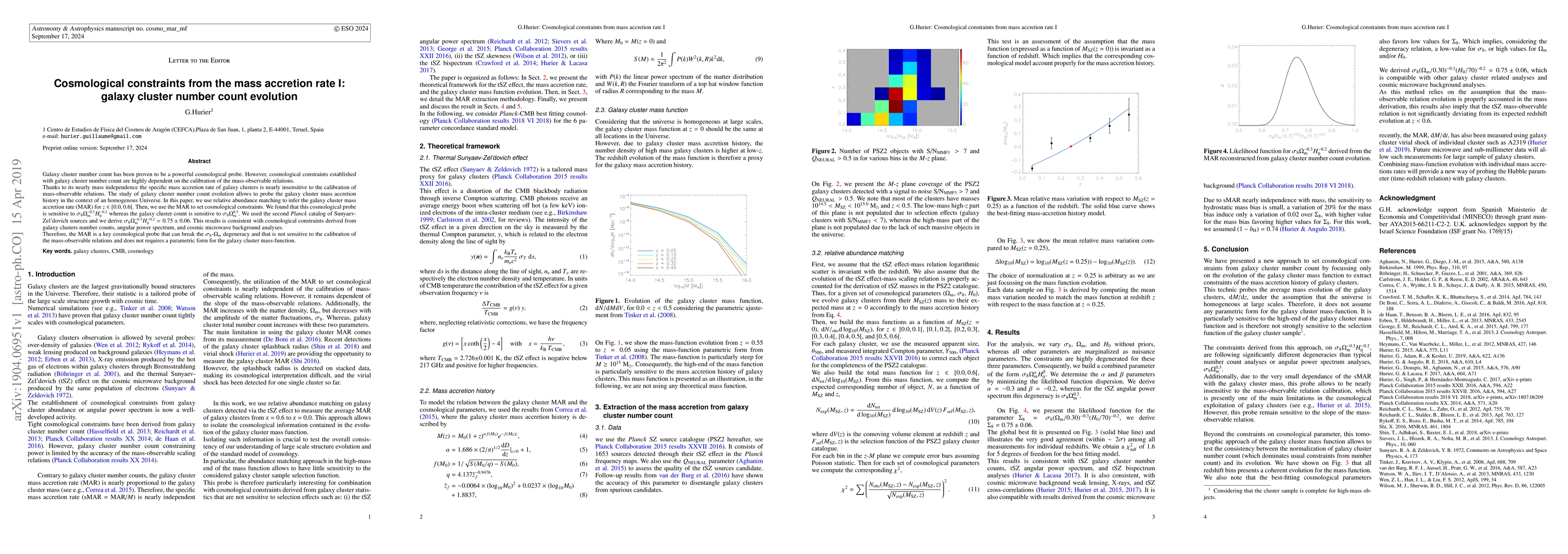 Galaxy cluster number count has been proven to be a powerful cosmological probe. However, cosmological constraints established with galaxy cluster number count are highly dependent on the calibration of the mass-observable relations. Thanks to its nearly mass independence the specific mass accretion rate of galaxy clusters is nearly insensitive to the calibration of mass-observable relations. The study of galaxy cluster number count evolution allows to probe the galaxy cluster mass accretion history in the context of an homogenous Universe. In this paper, we use relative abundance matching to infer the galaxy cluster mass accretion rate (MAR) for $z \in [0.0,0.6[$. Then, we use the MAR to set cosmological constraints. We found that this cosmological probe is sensitive to $\sigma_8 \Omega_{\rm m}^{-0.3} H_0^{-0.2}$ whereas the galaxy cluster count is sensitive to $\sigma_8 \Omega_{\rm m}^{0.3}$. We used the second $Planck$ catalog of Sunyaev-Zel'dovich sources and we derive $\sigma_8 \Omega_{\rm m}^{-0.3} H_0^{-0.2} = 0.75 \pm 0.06$. This results is consistent with cosmological constraints derived from galaxy clusters number counts, angular power spectrum, and cosmic microwave background analyses. Therefore, the MAR is a key cosmological probe that can break the $\sigma_8$-$\Omega_{\rm m}$ degeneracy and that is not sensitive to the calibration of the mass-observable relations and does not requires a parametric form for the galaxy cluster mass-function.