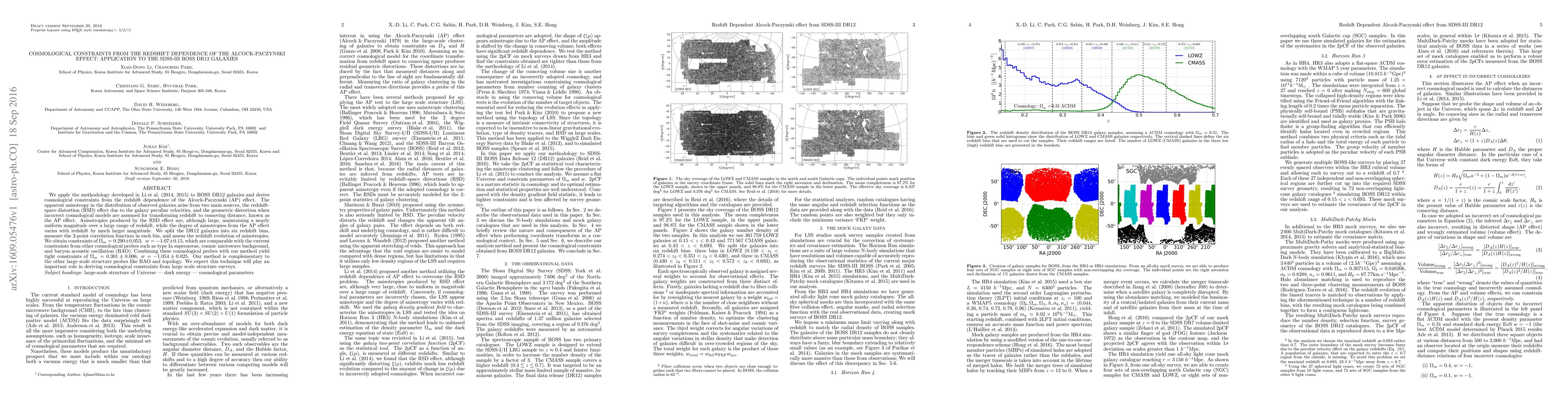 This paper uses the Alcock-Paczynski effect in BOSS DR12 galaxies to derive cosmological constraints, finding $\Omega_m=0.290 \pm 0.053$ and $w = -1.07 \pm 0.15$. Combining with other probes tightens these to $\Omega_m = 0.301 \pm 0.006$ and $w=-1.054 \pm 0.025$, demonstrating the method's complementary role to BAO and other large scale structure surveys.