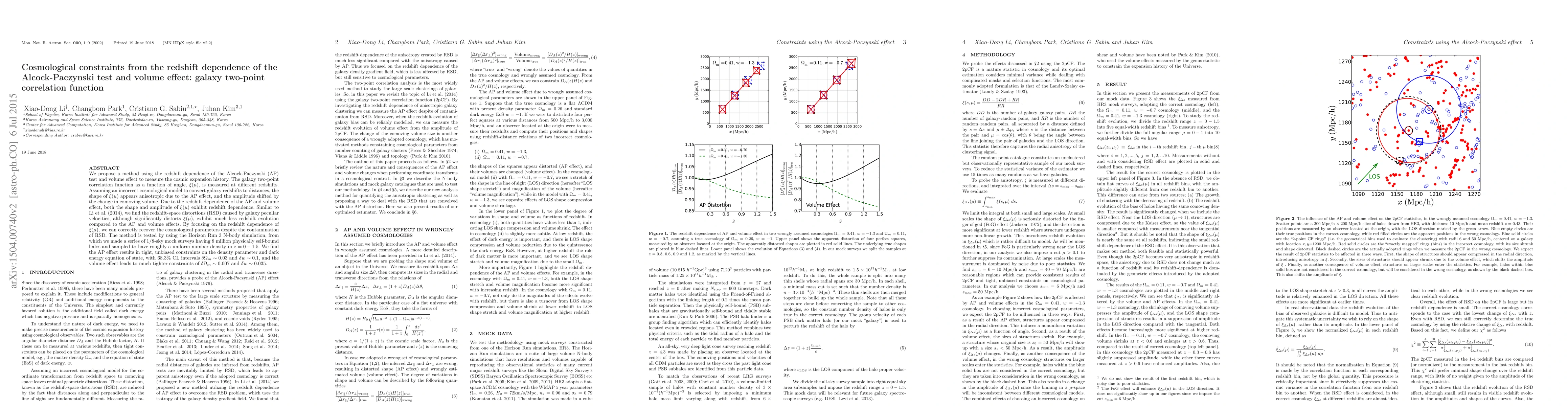 We propose a method using the redshift dependence of the Alcock-Paczynski (AP) test and volume effect to measure the cosmic expansion history. The galaxy two-point correlation function as a function of angle, $\xi(\mu)$, is measured at different redshifts. Assuming an incorrect cosmological model to convert galaxy redshifts to distances, the shape of $\xi(\mu)$ appears anisotropic due to the AP effect, and the amplitude shifted by the change in comoving volume. Due to the redshift dependence of the AP and volume effect, both the shape and amplitude of $\xi(\mu)$ exhibit redshift dependence. Similar to Li et.al (2014), we find the redshift-space distortions (RSD) caused by galaxy peculiar velocities, although significantly distorts $\xi(\mu)$, exhibit much less redshift evolution compared to the AP and volume effects. By focusing on the redshift dependence of $\xi(\mu)$, we can correctly recover the cosmological parameters despite the contamination of RSD. The method is tested by using the Horizon Run 3 N-body simulation, from which we made a series of $1/8$-sky mock surveys having 8 million physically self-bound halos and sampled to have roughly a uniform number density in $z=0-1.5$. We find the AP effect results in tight, unbiased constraints on the density parameter and dark energy equation of state, with 68.3% CL intervals $\delta \Omega_m\sim0.03$ and $\delta w\sim0.1$, and the volume effect leads to much tighter constraints of $\delta \Omega_m\sim0.007$ and $\delta w\sim0.035$.