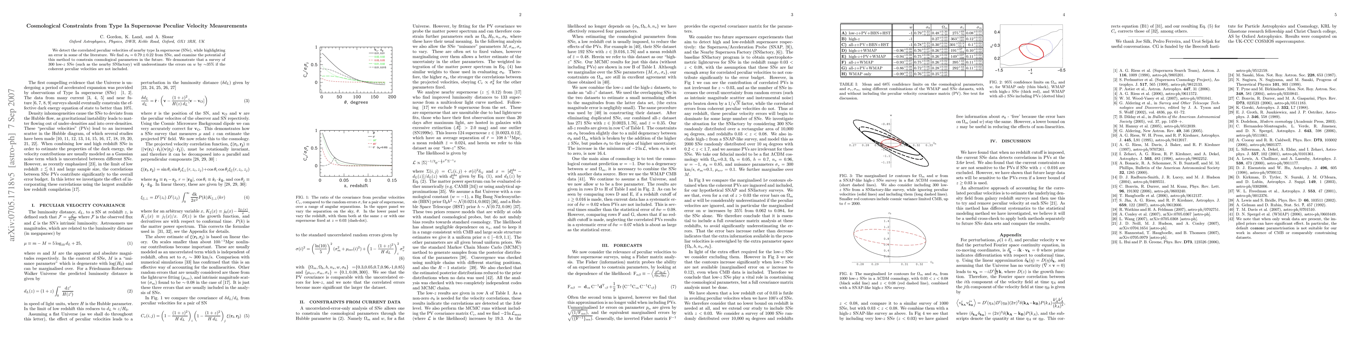 We detect the correlated peculiar velocities of nearby type Ia supernovae (SNe), while highlighting an error in some of the literature. We find sigma_8=0.79 +/- 0.22 from SNe, and examine the potential of this method to constrain cosmological parameters in the future. We demonstrate that a survey of 300 low-z SNe (such as the nearby SNfactory) will underestimate the errors on w by about 35% if the coherent peculiar velocities are not included.