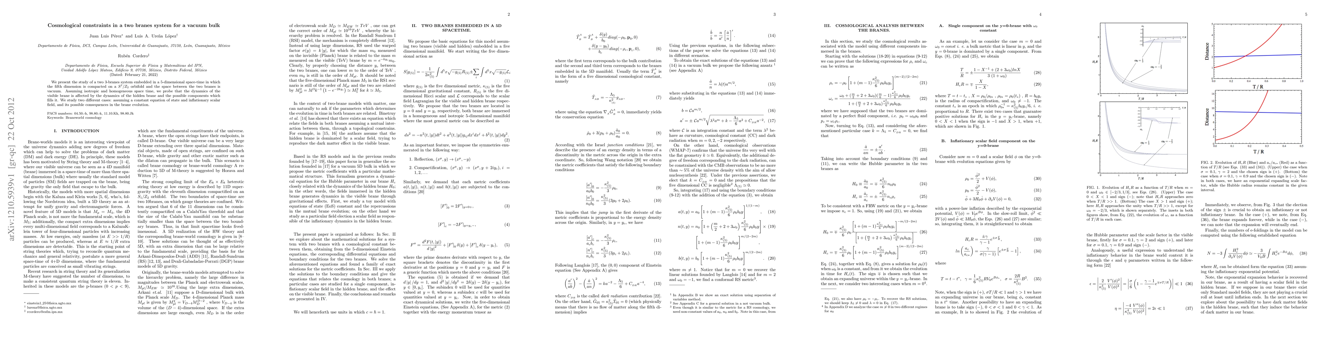 This research explores a two branes system in a 5D vacuum bulk, demonstrating that the visible brane's dynamics are influenced by the hidden brane's dynamics. Two cases are studied: one with a constant equation of state and another involving an inflationary scalar field, revealing their effects on brane evolution.