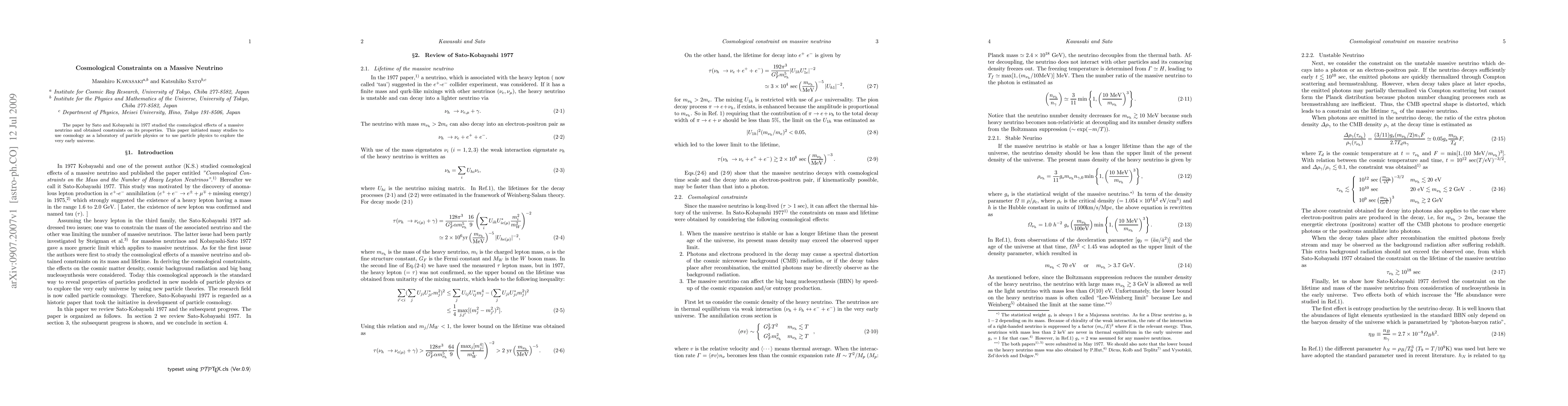 The paper by Sato and Kobayashi in 1977 studied the cosmological effects of a massive neutrino and obtained constraints on its properties. This paper initiated many studies to use cosmology as a laboratory of particle physics or to use particle physics to explore the very early universe.