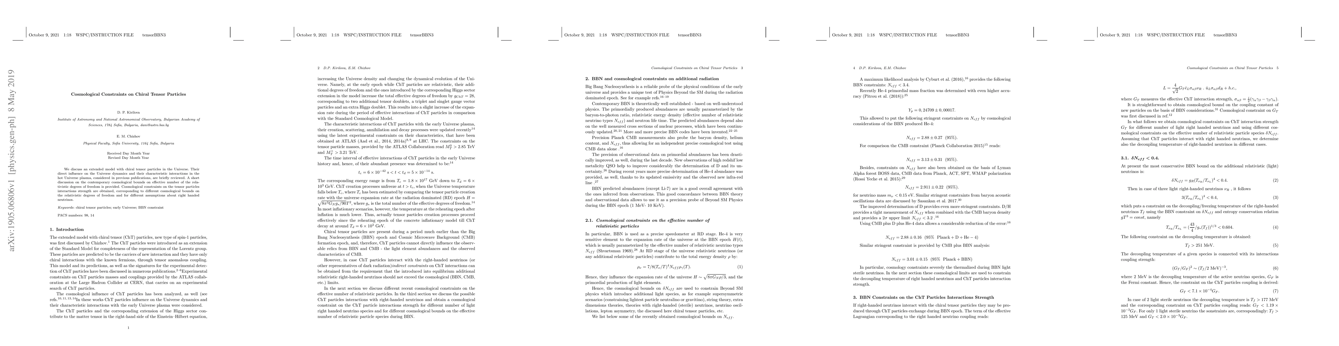 We discuss an extended model with chiral tensor particles in the Universe. Their direct influence on the Universe dynamics and their characteristic interactions in the hot Universe plasma, considered in previous publications, are briefly reviewed. A short discussion on the contemporary cosmological bounds on effective number of the relativistic degrees of freedom is provided. Cosmological constraints on the tensor particles interactions strength are obtained, corresponding to different cosmological bounds on the relativistic degrees of freedom and for different assumptions about right handed neutrinos.