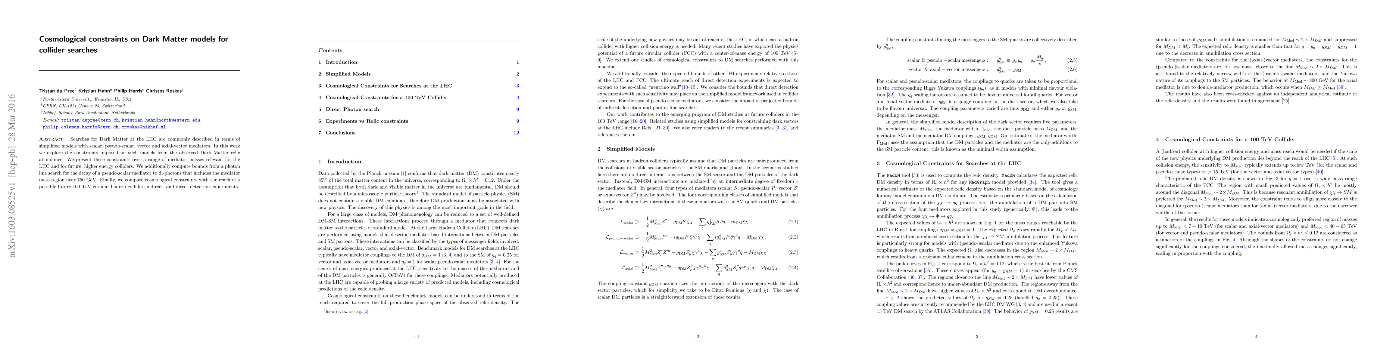 This paper investigates the cosmological constraints on Dark Matter models mediated by scalar, pseudo-scalar, vector, and axial-vector particles, relevant for collider searches. It presents constraints from the observed Dark Matter relic abundance and photon line searches, comparing these with the capabilities of future colliders and detection experiments.