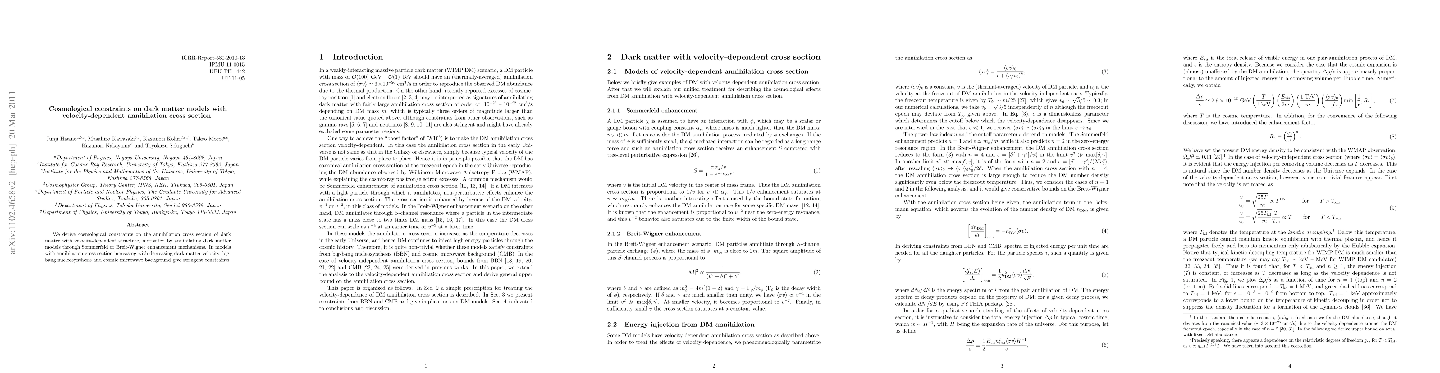 This paper derives stringent cosmological constraints on dark matter models where the annihilation cross section increases with lower velocities, using big-bang nucleosynthesis and cosmic microwave background data. These constraints are particularly relevant for models utilizing Sommerfeld or Breit-Wigner enhancement mechanisms.
