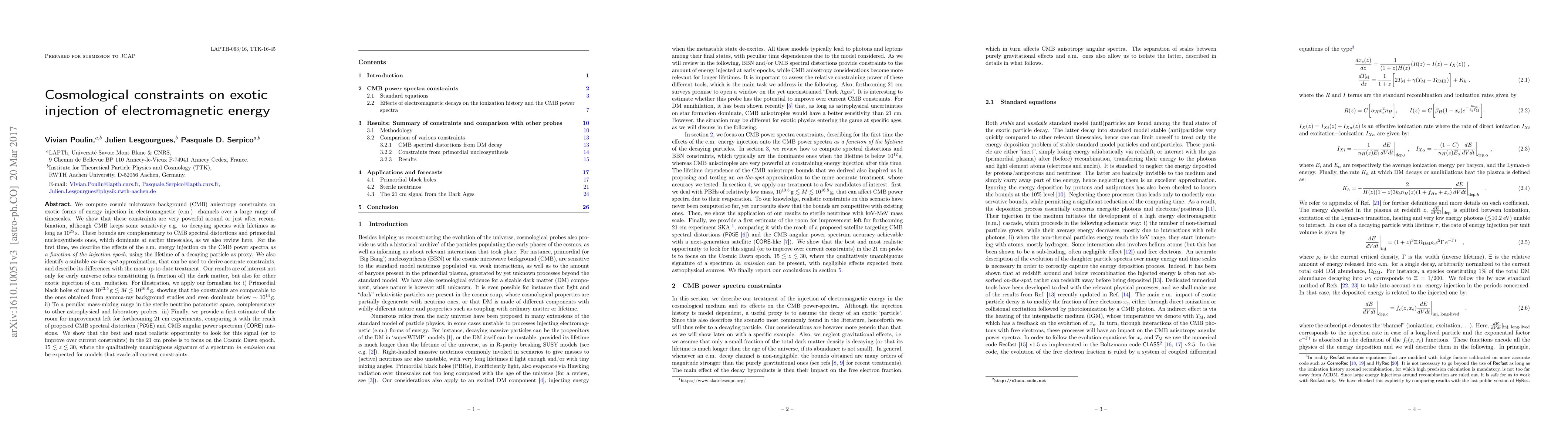 We compute cosmic microwave background (CMB) anisotropy constraints on exotic forms of energy injection in electromagnetic (e.m.) channels over a large range of timescales. These constraints are very powerful around or just after recombination, although CMB keeps some sensitivity e.g. to decaying species with lifetimes as long as $10^{25}\,$s. We review here complementary with CMB spectral distortions and primordial nucleosynthesis bounds, which dominate at earlier timescales. For the first time, we describe the effects of the e.m. energy injection on the CMB power spectra as a function of the injection epoch, using the lifetime of a decaying particle as proxy. We identify a suitable on-the-spot approximation. Our results are of interest not only for early universe relics constituting (a fraction of) the dark matter, but also for other exotic injection of e.m. radiation. For illustration, we apply our formalism to: i) Primordial black holes of mass $\in [10^{13.5},10^{16.8}]$ g, showing that the constraints are comparable to the ones obtained from gamma-ray background studies and even dominate below $\sim 10^{14}$g. ii) To a peculiar mass-mixing range in the sterile neutrino parameter space, complementary to other astrophysical and laboratory probes. iii) Finally, we provide a first estimate of the room for improvement left for forthcoming 21 cm experiments, comparing it with the reach of proposed CMB spectral distortion (PiXiE) and CMB angular power spectrum (CORE) missions. We show that the best and most realistic opportunity to look for this signal (or to improve over current constraints) in the 21 cm probe is to focus on the Cosmic Dawn epoch, $15\lesssim z\lesssim30$, where the qualitatively unambiguous signature of a spectrum in emission can be expected for models that evade all current constraints.