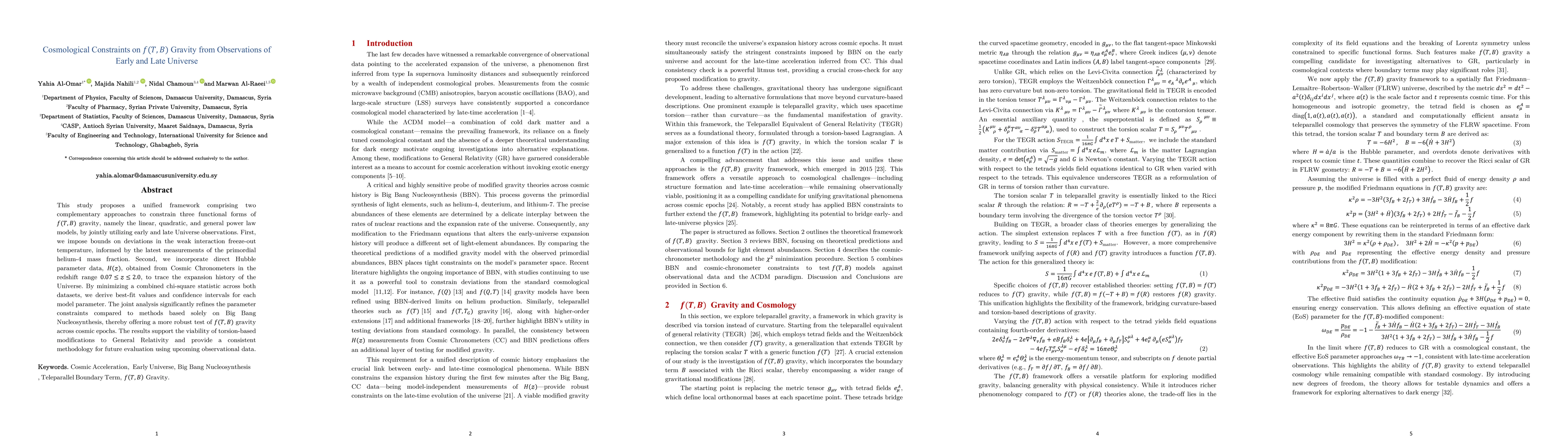 This study proposes a unified framework comprising two complementary approaches to constrain three functional forms of $f(T,B)$ gravity, namely the linear, quadratic, and general power law models, by jointly utilizing early and late Universe observations. First, we impose bounds on deviations in the weak interaction freeze-out temperature, informed by the latest measurements of the primordial helium-4 mass fraction. Second, we incorporate direct Hubble parameter data, $H(\mathcal{z})$, obtained from Cosmic Chronometers in the redshift range $0.07\le\mathcal{z}\le2.0$, to trace the expansion history of the Universe. By minimizing a combined chi-square statistic across both datasets, we derive the best-fit values and confidence intervals for each model parameter. The joint analysis significantly refines the parameter constraints compared to methods based solely on Big Bang Nucleosynthesis, thereby offering a more robust test of $f(T,B)$ gravity across cosmic epochs. The results support the viability of torsion-based modifications to General Relativity and provide a consistent methodology for future evaluation using upcoming observational data.