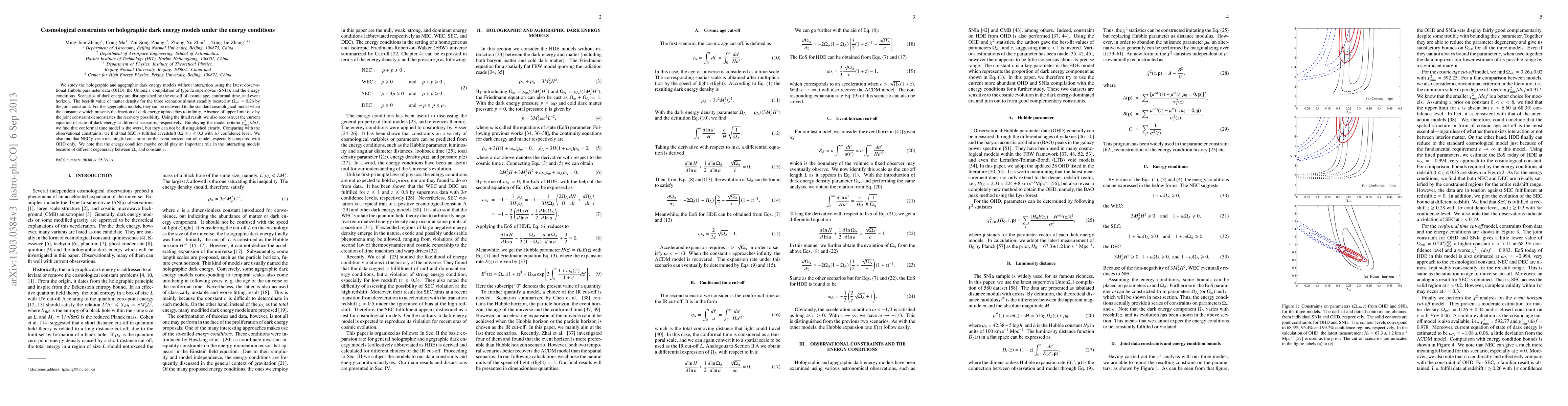 This paper investigates the holographic and agegraphic dark energy models using observational data and energy conditions, finding that the matter density $\Omega_{m0}$ is consistently around 0.26. The agegraphic models recover to the standard cosmological model as the dark energy fraction $c$ approaches infinity, with no upper limit for $c$ observed.
