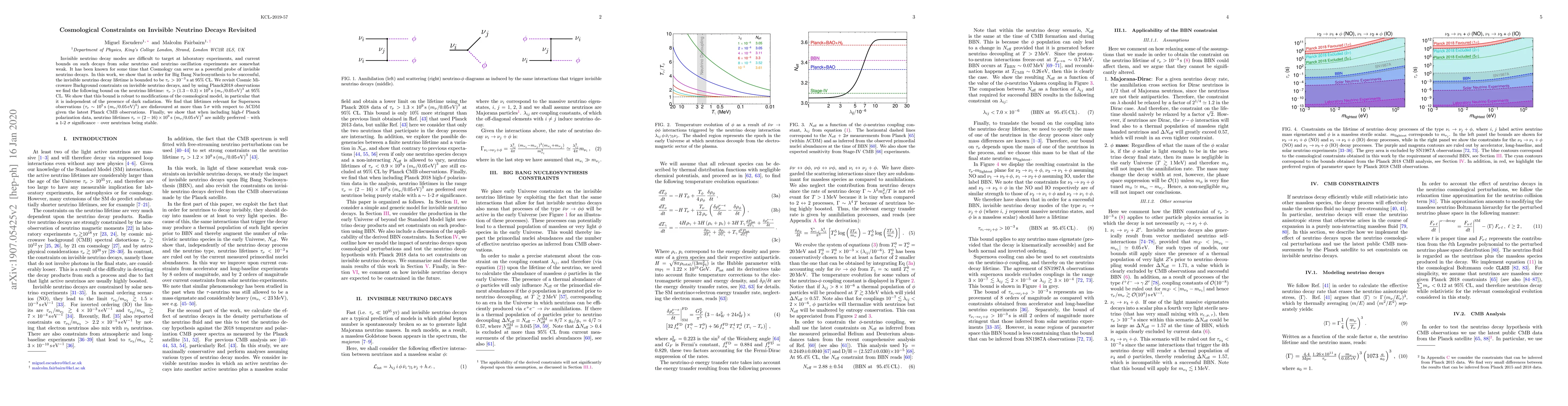 Invisible neutrino decay modes are difficult to target at laboratory experiments, and current bounds on such decays from solar neutrino and neutrino oscillation experiments are somewhat weak. It has been known for some time that Cosmology can serve as a powerful probe of invisible neutrino decays. In this work, we show that in order for Big Bang Nucleosynthesis to be successful, the invisible neutrino decay lifetime is bounded to be $\tau_\nu > 10^{-3}\,\text{s}$ at 95\% CL. We revisit Cosmic Microwave Background constraints on invisible neutrino decays, and by using Planck2018 observations we find the following bound on the neutrino lifetime: $\tau_\nu > (1.3-0.3)\times 10^{9}\,\text{s} \, \left({m_\nu}/{ 0.05\,\text{eV} }\right)^3$ at $95\%$ CL. We show that this bound is robust to modifications of the cosmological model, in particular that it is independent of the presence of dark radiation. We find that lifetimes relevant for Supernova observations ($\tau_\nu \sim 10^{5}\,\text{s}\, \left({m_\nu}/{ 0.05\,\text{eV} }\right)^3$) are disfavoured at more than $5\,\sigma$ with respect to $\Lambda$CDM given the latest Planck CMB observations. Finally, we show that when including high-$\ell$ Planck polarization data, neutrino lifetimes $\tau_\nu = (2-16)\times 10^{9}\,\text{s} \, \left({m_\nu}/{ 0.05\,\text{eV} }\right)^3$ are mildly preferred -- with a 1-2 $\sigma$ significance -- over neutrinos being stable.