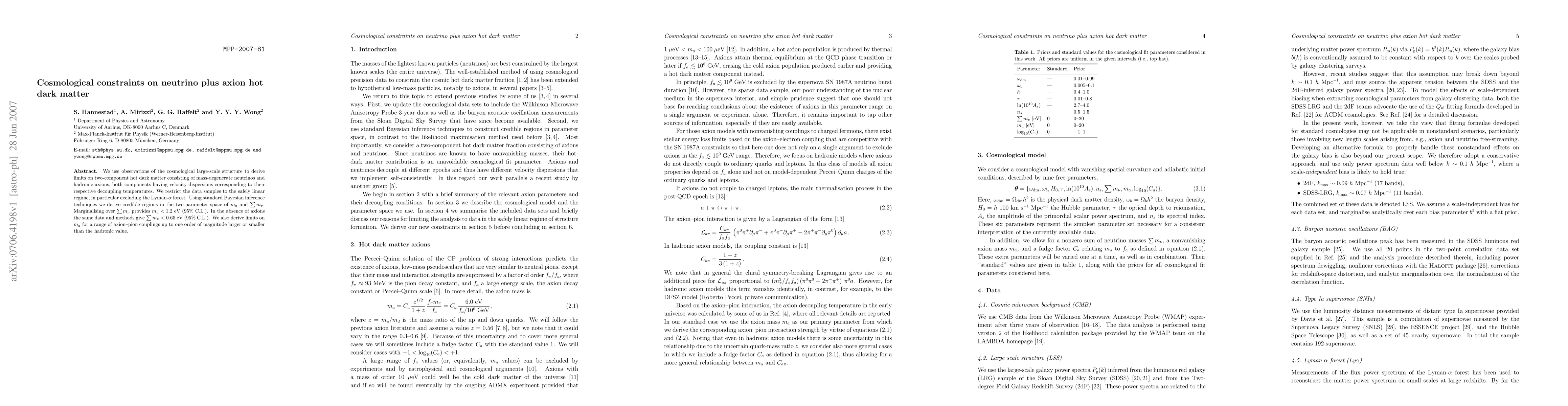 Researchers used large-scale structure observations to constrain hot dark matter consisting of neutrinos and axions, setting limits on axion mass and neutrino sum.