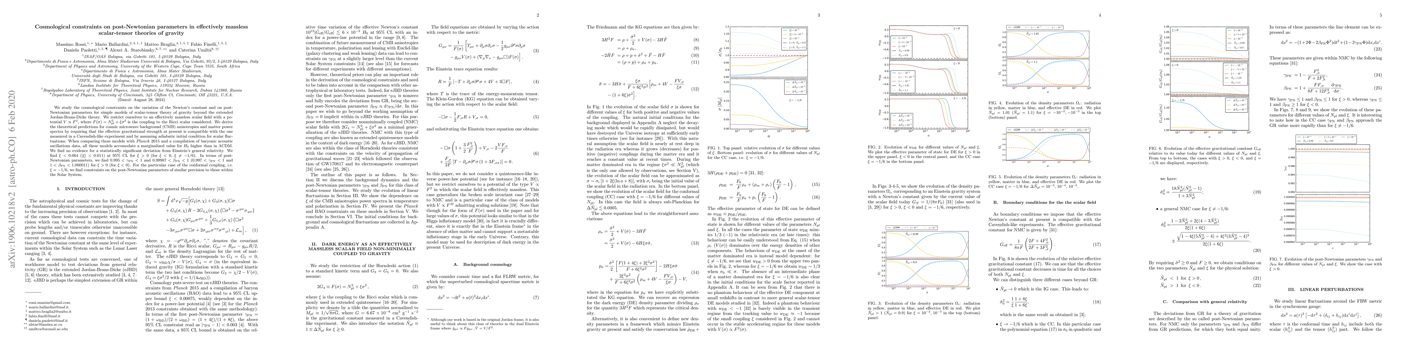 We study the cosmological constraints on the variation of the Newton's constant and on post-Newtonian parameters for simple models of scalar-tensor theory of gravity beyond the extended Jordan-Brans-Dicke theory. We restrict ourselves to an effectively massless scalar field with a potential $V \propto F^2$, where $F(\sigma)=N_{pl}^2+\xi\sigma^2$ is the coupling to the Ricci scalar considered. We derive the theoretical predictions for cosmic microwave background (CMB) anisotropies and matter power spectra by requiring that the effective gravitational strength at present is compatible with the one measured in a Cavendish-like experiment and by assuming adiabatic initial condition for scalar fluctuations. When comparing these models with $Planck$ 2015 and a compilation of baryonic acoustic oscilation (BAO) data, all these models accomodate a marginalized value for $H_0$ higher than in $\Lambda$CDM. We find no evidence for a statistically significant deviation from Einstein's general relativity. We find $\xi < 0.064$ ($|\xi| < 0.011$) at 95 % CL for $\xi > 0$ (for $\xi < 0$, $\xi \ne -1/6$). In terms of post-Newtonian parameters, we find $0.995 < \gamma_{\rm PN} < 1$ and $0.99987 < \beta_{\rm PN} < 1$ ($0.997 < \gamma_{\rm PN} < 1$ and $1 < \beta_{\rm PN} < 1.000011$) for $\xi >0$ (for $\xi < 0$). For the particular case of the conformal coupling, i.e. $\xi=-1/6$, we find constraints on the post-Newtonian parameters of similar precision to those within the Solar System.