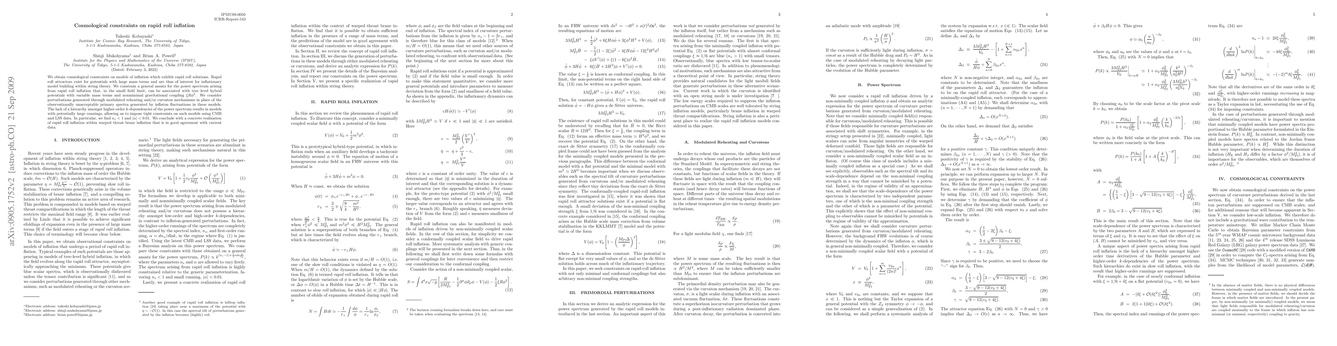 We obtain cosmological constraints on models of inflation which exhibit rapid roll solutions. Rapid roll attractors exist for potentials with large mass terms and are thus of interest for inflationary model building within string theory. We constrain a general ansatz for the power spectrum arising from rapid roll inflation that, in the small field limit, can be associated with tree level hybrid potentials with variable mass terms and nonminimal gravitational coupling $\xi R\phi^2$. We consider perturbations generated through modulated reheating and/or curvaton mechanisms in place of the observationally unacceptable primary spectra generated by inflaton fluctuations in these models. The lack of a hierarchy amongst higher-order $k$-dependencies of the power spectrum results in models with potentially large runnings, allowing us to impose tight constraints on such models using CMB and LSS data. In particular, we find $n_s <1$ and $|\alpha| < 0.01$. We conclude with a concrete realization of rapid roll inflation within warped throat brane inflation that is in good agreement with current data.