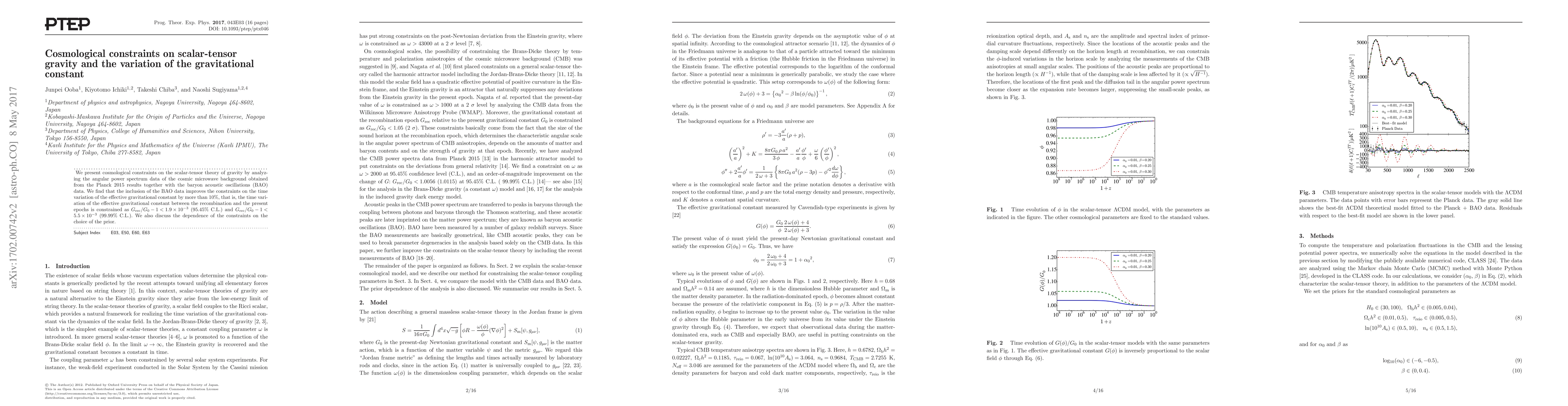 We present cosmological constraints on the scalar-tensor theory of gravity by analyzing the angular power spectrum data of the cosmic microwave background obtained from the Planck 2015 results together with the baryon acoustic oscillations (BAO) data. We find that the inclusion of the BAO data improves the constraints on the time variation of the effective gravitational constant by more than $10\%$, that is, the time variation of the effective gravitational constant between the recombination and the present epochs is constrained as $G_{\rm rec}/G_0-1 <1.9\times 10^{-3}\ (95.45\%\ {\rm C.L.})$ and $G_{\rm rec}/G_0-1 <5.5\times 10^{-3}\ (99.99 \%\ {\rm C.L.})$. We also discuss the dependence of the constraints on the choice of the prior.