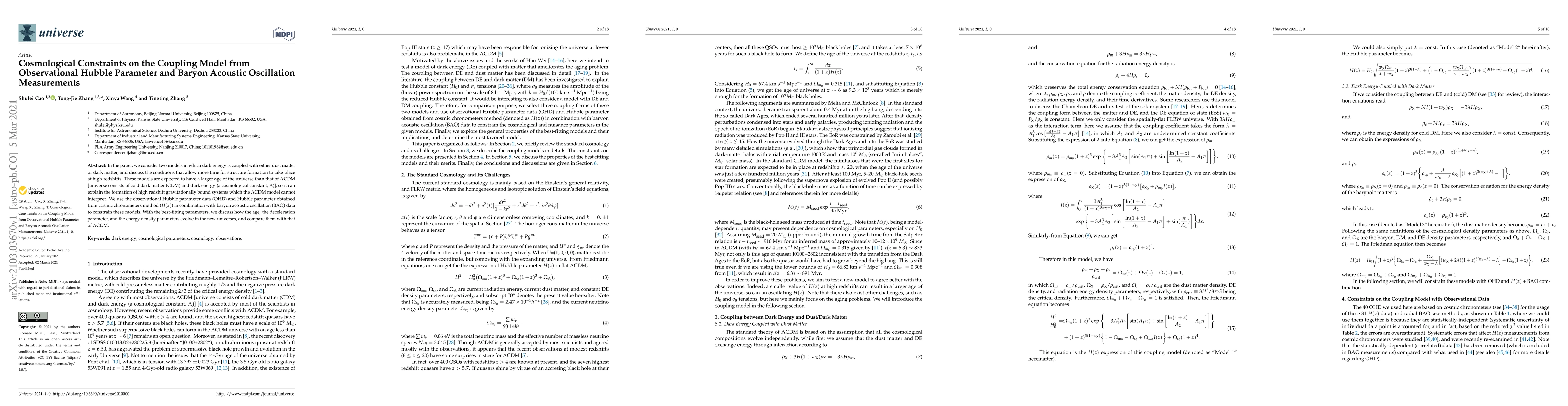 This paper examines two dark energy coupling models with matter, using observational Hubble parameter data and baryon acoustic oscillation measurements to constrain them. The models predict a larger age of the universe, potentially explaining high redshift structures better than the standard $\Lambda$CDM model.