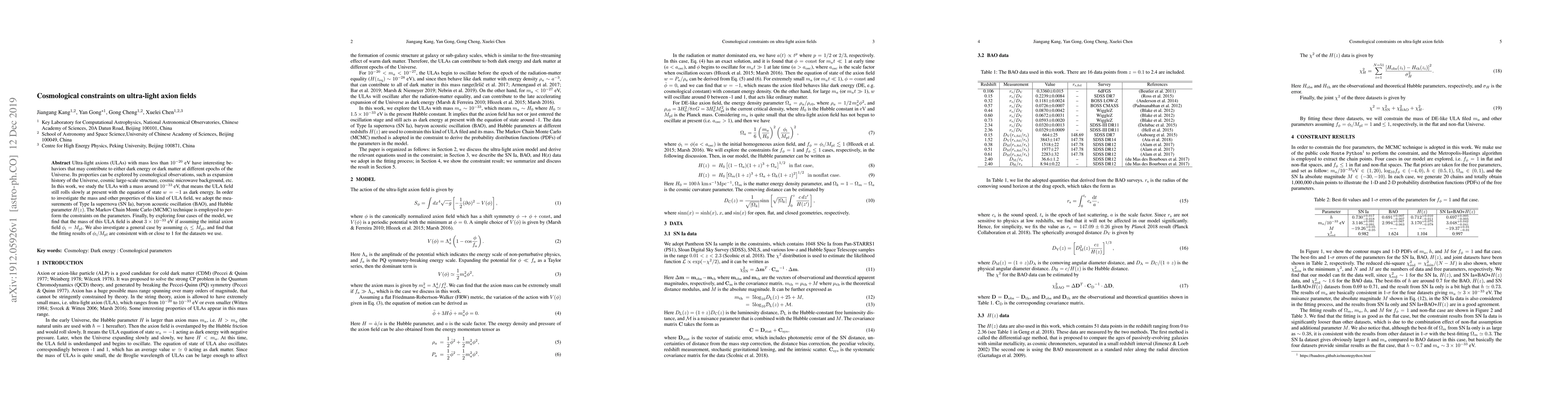 This research uses cosmological observations like SN Ia, BAO, and H(z) measurements to constrain ultra-light axion (ULA) fields with mass around 10^-33 eV. The MCMC technique reveals that the ULA mass is approximately 3x10^-33 eV, assuming an initial axion field phi_i=M_pl, and the results for a general case with phi_i<M_pl are consistent with or close to 1.