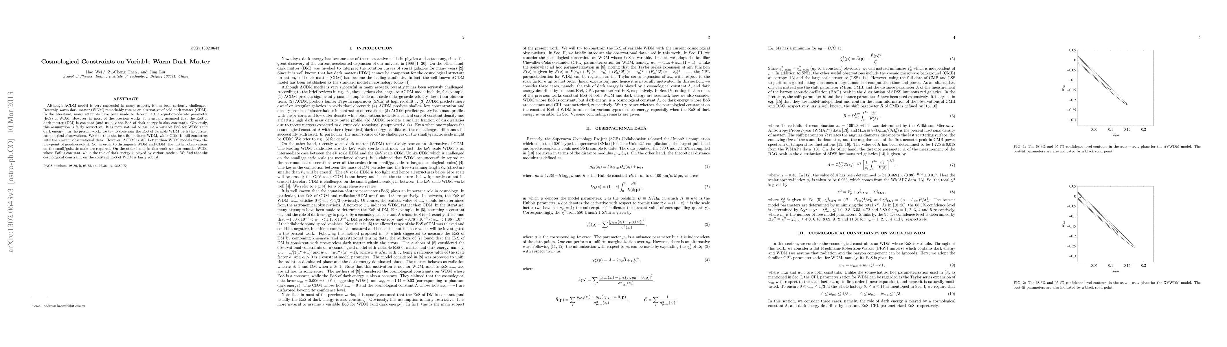 The research constrains the EoS of variable WDM with current cosmological observations.