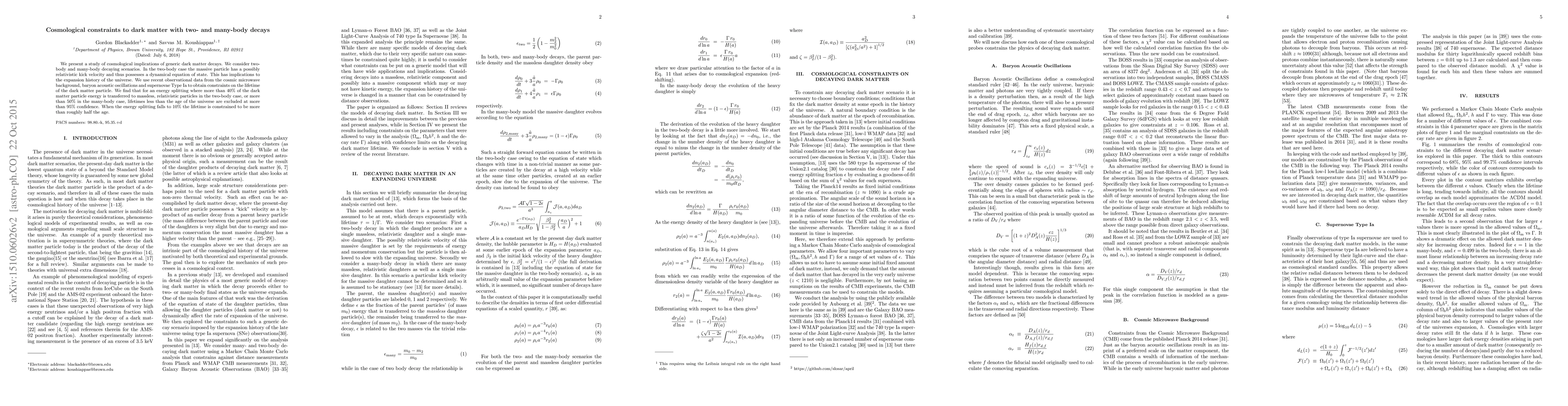 We present a study of cosmological implications of generic dark matter decays. We consider two-body and many-body decaying scenarios. In the two-body case the massive particle has a possibly relativistic kick velocity and thus possesses a dynamical equation of state. This has implications to the expansion history of the universe. We use recent observational data from the cosmic microwave background, baryon acoustic oscillations and supernovae Type Ia to obtain constraints on the lifetime of the dark matter particle. We find that for an energy splitting where more than 40% of the dark matter particle energy is transferred to massless, relativistic particles in the two-body case, or more than 50% in the many-body case, lifetimes less than the age of the universe are excluded at more than 95% confidence. When the energy splitting falls to 10% the lifetime is constrained to be more than roughly half the age.