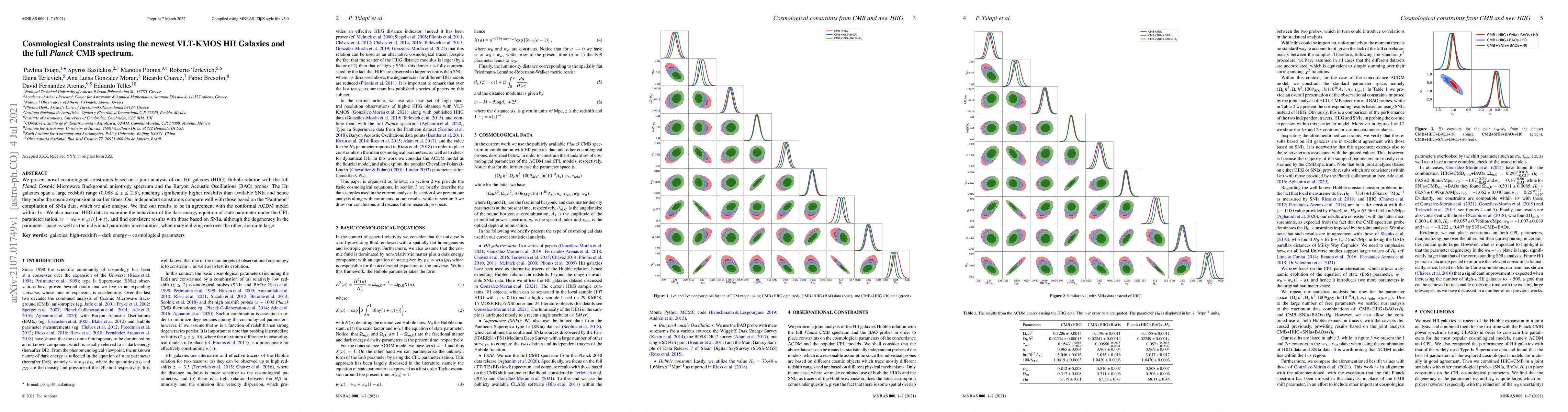 This paper presents cosmological constraints from a joint analysis of HII galaxies' Hubble relation and the full Planck CMB spectrum, showing agreement with the $\Lambda$CDM model. The study also investigates the dark energy equation of state parameter, finding consistent results with supernova data but with significant parameter uncertainties.
