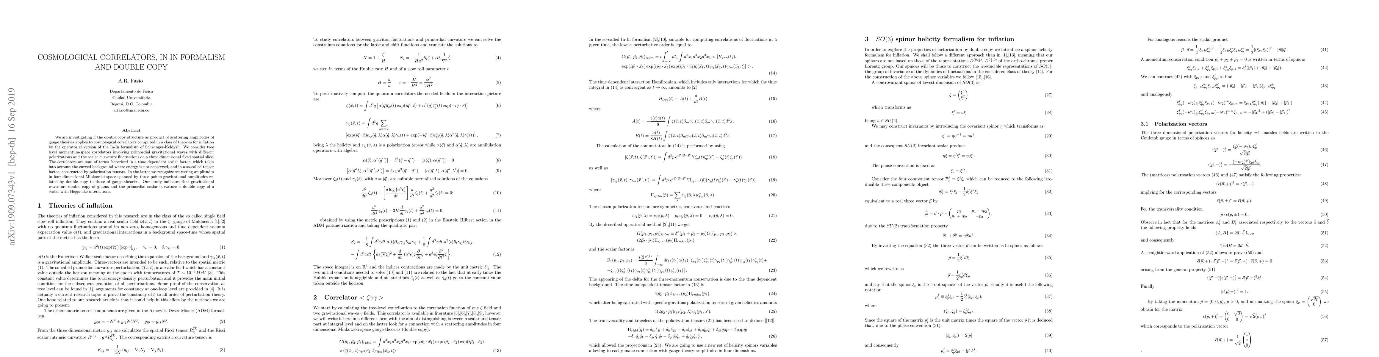 We are investigating if the double copy structure as product of scattering amplitudes of gauge theories applies to cosmological correlators computed in a class of theories for inflation by the operatorial version of the In-In formalism of Schwinger-Keldysh. We consider tree level momentum-space correlators involving primordial gravitational waves with different polarizations and the scalar curvature fluctuations on a three dimensional fixed spatial slice. The correlators are sum of terms factorized in a time dependent scalar factor, which takes into account the curved background where energy is not conserved, and in a so-called tensor factor, constructed by polarization tensors. In the latter we recognize scattering amplitudes in four dimensional Minkowski space spanned by three points gravitational amplitudes related by double copy to those of gauge theories. Our study indicates that gravitational waves are double copy of gluons and the primordial scalar curvature is double copy of a scalar with Higgs-like interactions.