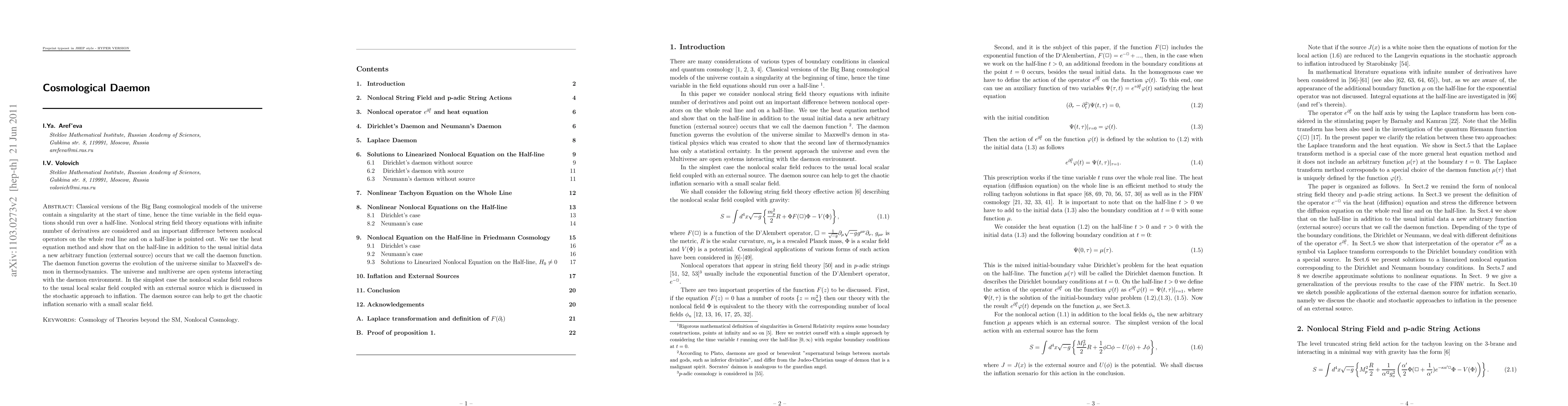 The paper introduces and analyzes nonlocal string field theory equations on a half-line, identifying a novel 'daemon function' that extends the standard cosmological models by incorporating an external source governing the universe's evolution.