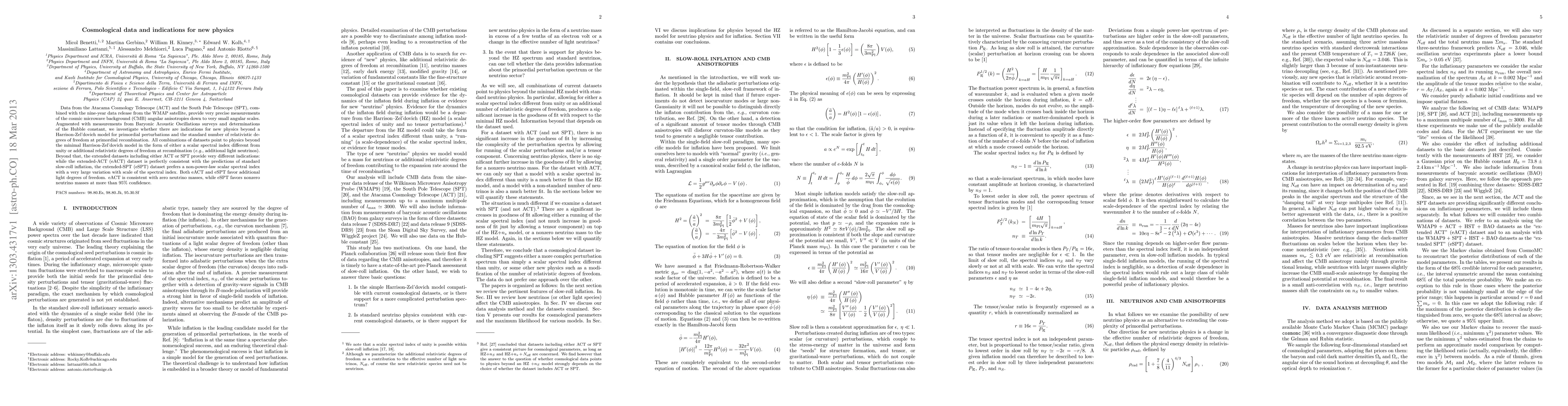 Data from the Atacama Cosmology Telescope (ACT) and the South Pole Telescope (SPT), combined with the nine-year data release from the WMAP satellite, provide very precise measurements of the cosmic microwave background (CMB) angular anisotropies down to very small angular scales. Augmented with measurements from Baryonic Acoustic Oscillations surveys and determinations of the Hubble constant, we investigate whether there are indications for new physics beyond a Harrison-Zel'dovich model for primordial perturbations and the standard number of relativistic degrees of freedom at primordial recombination. All combinations of datasets point to physics beyond the minimal Harrison-Zel'dovich model in the form of either a scalar spectral index different from unity or additional relativistic degrees of freedom at recombination (e.g., additional light neutrinos). Beyond that, the extended datasets including either ACT or SPT provide very different indications: while the extended-ACT (eACT) dataset is perfectly consistent with the predictions of standard slow-roll inflation, the extended-SPT (eSPT) dataset prefers a non-power-law scalar spectral index with a very large variation with scale of the spectral index. Both eACT and eSPT favor additional light degrees of freedom. eACT is consistent with zero neutrino masses, while eSPT favors nonzero neutrino masses at more than 95% confidence.