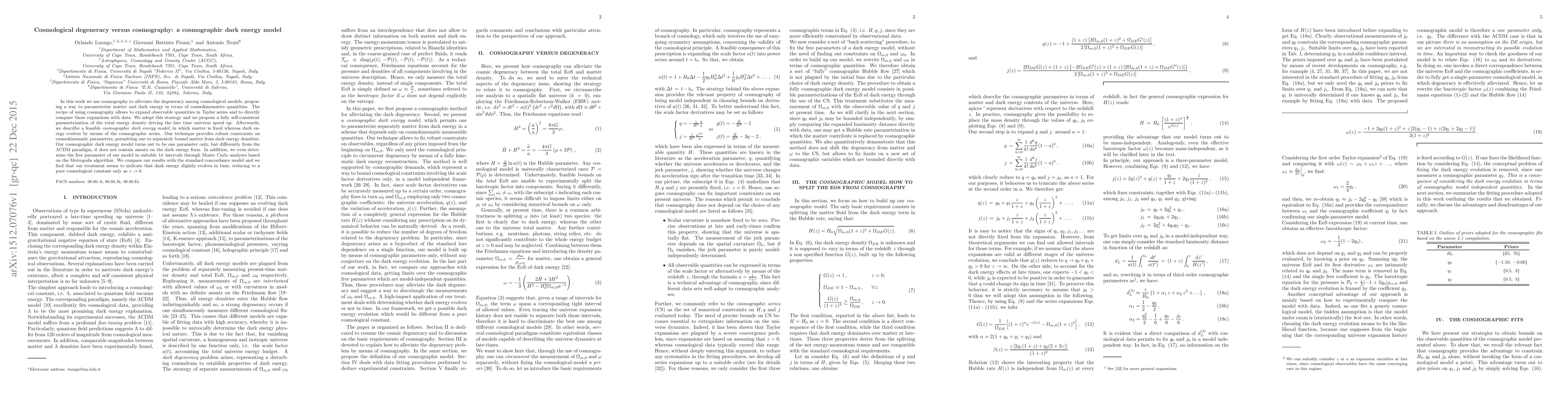 In this work we use cosmography to alleviate the degeneracy among cosmological models, proposing a way to parameterize matter and dark energy in terms of cosmokinematics quantities. The recipe of using cosmography allows to expand observable quantities in Taylor series and to directly compare those expansions with data. We adopt this strategy and we propose a fully self-consistent parametrization of the total energy density driving the late time universe speed up. Afterwards, we describe a feasible \emph{cosmographic dark energy model}, in which matter is fixed whereas dark energy evolves by means of the cosmographic series. Our technique provides robust constraints on cosmokinematic parameters, permitting one to separately bound matter from dark energy densities. Our cosmographic dark energy model turns out to be one parameter only, but differently from the $\Lambda$CDM paradigm, it does not contain ansatz on the dark energy form. In addition, we even determine the free parameter of our model in suitable $1\sigma$ intervals through Monte Carlo analyses based on the Metropolis algorithm. We compare our results with the standard concordance model and we find that our treatment seems to indicate that dark energy slightly evolves in time, reducing to a pure cosmological constant only as $z\rightarrow0$.