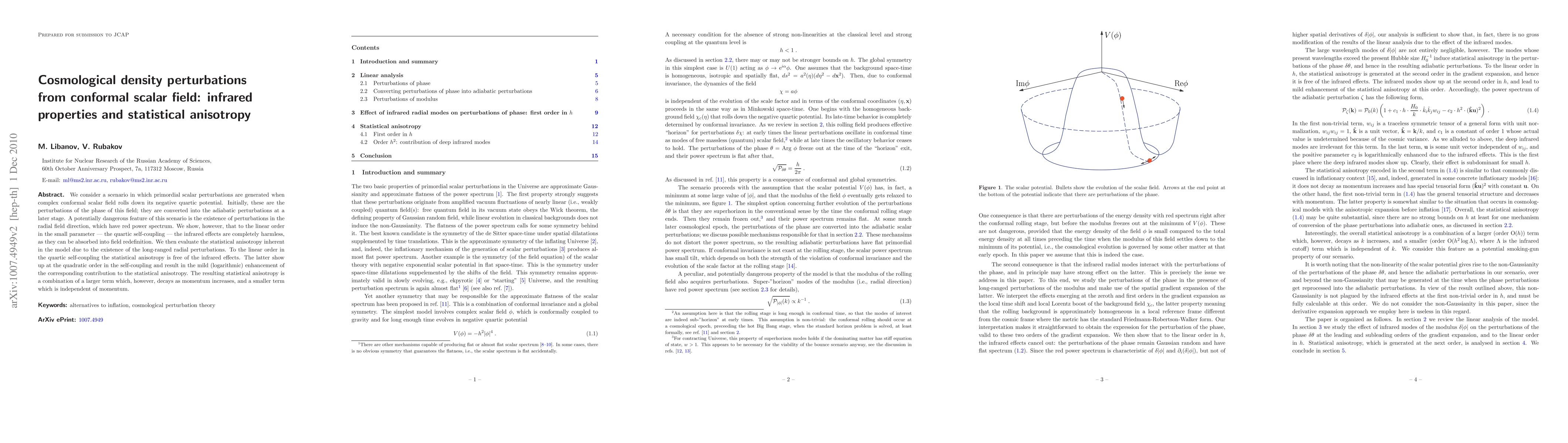 We consider a scenario in which primordial scalar perturbations are generated when complex conformal scalar field rolls down its negative quartic potential. Initially, these are the perturbations of the phase of this field; they are converted into the adiabatic perturbations at a later stage. A potentially dangerous feature of this scenario is the existence of perturbations in the radial field direction, which have red power spectrum. We show, however, that to the linear order in the small parameter - the quartic self-coupling - the infrared effects are completely harmless, as they can be absorbed into field redefinition. We then evaluate the statistical anisotropy inherent in the model due to the existence of the long-ranged radial perturbations. To the linear order in the quartic self-coupling the statistical anisotropy is free of the infrared effects. The latter show up at the quadratic order in the self-coupling and result in the mild (logarithmic) enhancement of the corresponding contribution to the statistical anisotropy. The resulting statistical anisotropy is a combination of a larger term which, however, decays as momentum increases, and a smaller term which is independent of momentum.