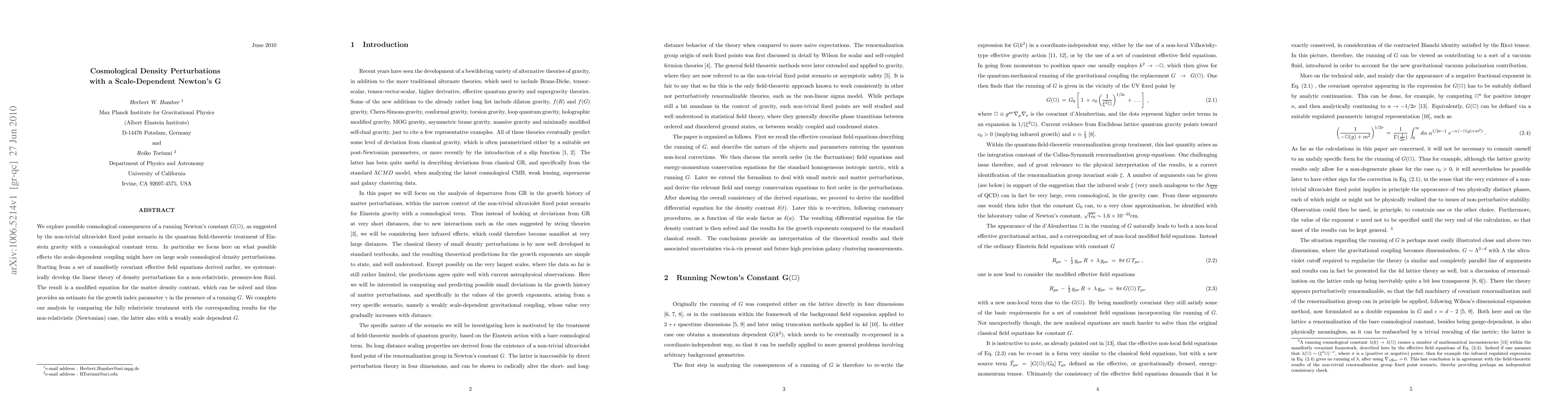 We explore possible cosmological consequences of a running Newton's constant $ G ( \Box ) $, as suggested by the non-trivial ultraviolet fixed point scenario in the quantum field-theoretic treatment of Einstein gravity with a cosmological constant term. In particular we focus here on what possible effects the scale-dependent coupling might have on large scale cosmological density perturbations. Starting from a set of manifestly covariant effective field equations derived earlier, we systematically develop the linear theory of density perturbations for a non-relativistic, pressure-less fluid. The result is a modified equation for the matter density contrast, which can be solved and thus provides an estimate for the growth index parameter $\gamma$ in the presence of a running $G$. We complete our analysis by comparing the fully relativistic treatment with the corresponding results for the non-relativistic (Newtonian) case, the latter also with a weakly scale dependent $G$.