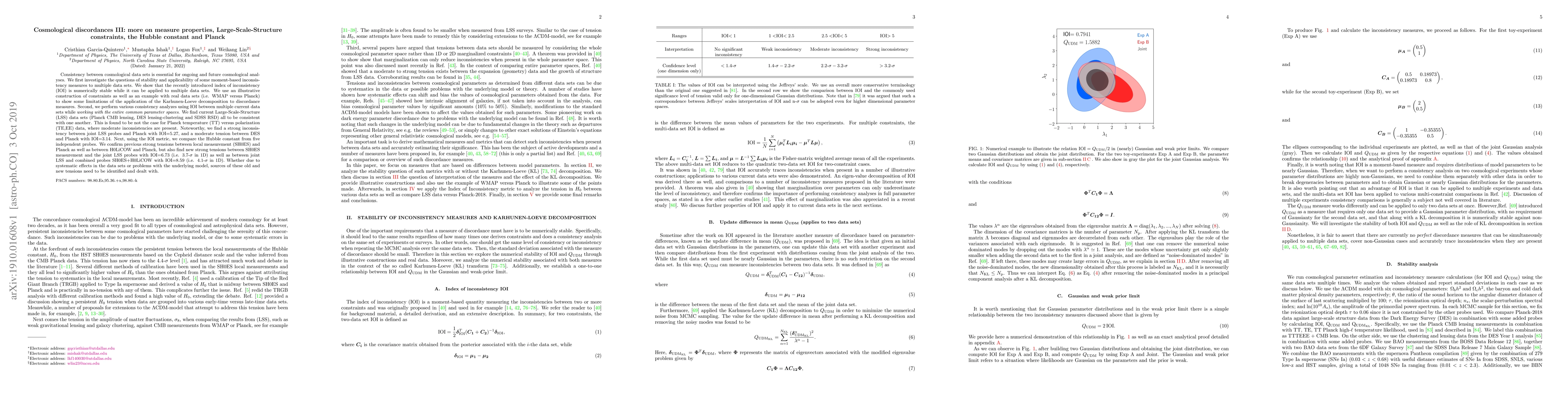 Consistency between cosmological data sets is essential for ongoing and future cosmological analyses. We first investigate the questions of stability and applicability of some moment-based inconsistency measures to multiple data sets. We show that the recently introduced index of inconsistency (IOI) is numerically stable while it can be applied to multiple data sets. We use an illustrative construction of constraints as well as an example with real data sets (i.e. WMAP versus Planck) to show some limitations of the application of the Karhunen-Loeve decomposition to discordance measures. Second, we perform various consistency analyzes using IOI between multiple current data sets while \textit{working with the entire common parameter spaces}. We find current Large-Scale-Structure (LSS) data sets (Planck CMB lensing, DES lensing-clustering and SDSS RSD) all to be consistent with one another. This is found to be not the case for Planck temperature (TT) versus polarization (TE,EE) data, where moderate inconsistencies are present. Noteworthy, we find a strong inconsistency between joint LSS probes and Planck with IOI=5.27, and a moderate tension between DES and Planck with IOI=3.14. Next, using the IOI metric, we compare the Hubble constant from five independent probes. We confirm previous strong tensions between local measurement (SH0ES) and Planck as well as between H0LiCOW and Planck, but also find new strong tensions between SH0ES measurement and the joint LSS probes with IOI=6.73 (i.e. 3.7-$\sigma$ in 1D) as well as between joint LSS and combined probes SH0ES+H0LiCOW with IOI=8.59 (i.e. 4.1-$\sigma$ in 1D). Whether due to systematic effects in the data sets or problems with the underlying model, sources of these old and new tensions need to be identified and dealt with.