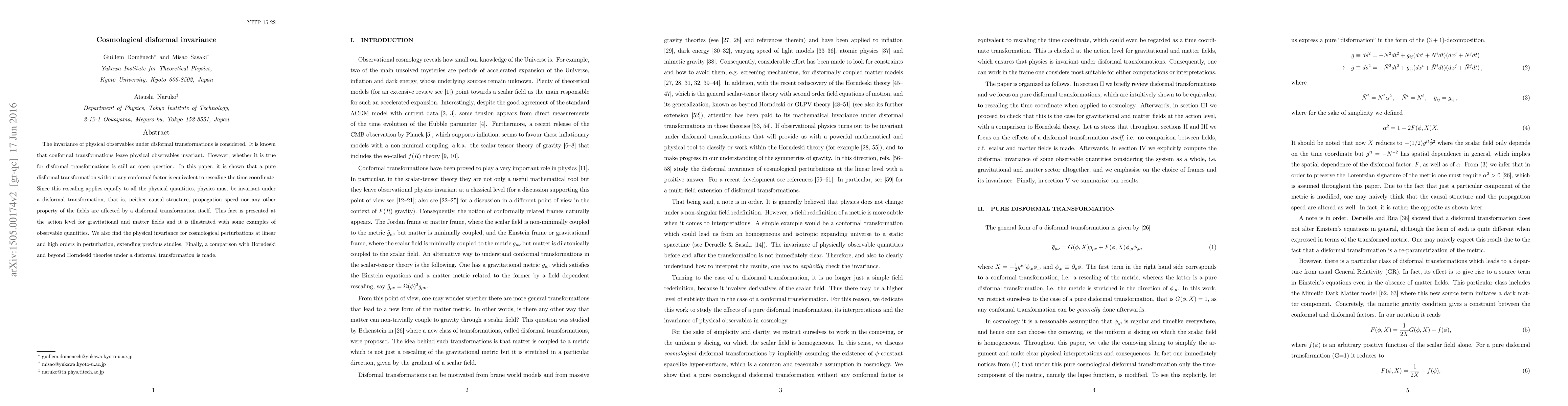 This paper demonstrates that physical observables remain invariant under pure disformal transformations, as these transformations effectively amount to a time coordinate rescaling, preserving causal structure and field properties. It extends this invariance to cosmological perturbations and compares disformal invariance with Horndeski and beyond Horndeski theories.