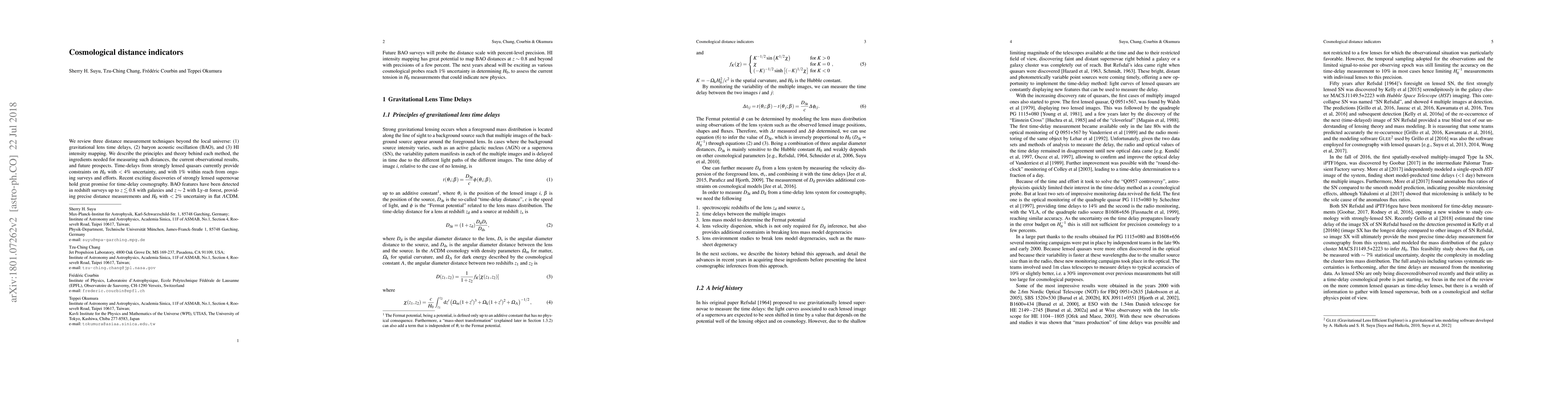 We review three distance measurement techniques beyond the local universe: (1) gravitational lens time delays, (2) baryon acoustic oscillation (BAO), and (3) HI intensity mapping. We describe the principles and theory behind each method, the ingredients needed for measuring such distances, the current observational results, and future prospects. Time delays from strongly lensed quasars currently provide constraints on $H_0$ with < 4% uncertainty, and with 1% within reach from ongoing surveys and efforts. Recent exciting discoveries of strongly lensed supernovae hold great promise for time-delay cosmography. BAO features have been detected in redshift surveys up to z <~ 0.8 with galaxies and z ~ 2 with Ly-$\alpha$ forest, providing precise distance measurements and $H_0$ with < 2% uncertainty in flat $\Lambda$CDM. Future BAO surveys will probe the distance scale with percent-level precision. HI intensity mapping has great potential to map BAO distances at z ~ 0.8 and beyond with precisions of a few percent. The next years ahead will be exciting as various cosmological probes reach 1% uncertainty in determining $H_0$, to assess the current tension in $H_0$ measurements that could indicate new physics.