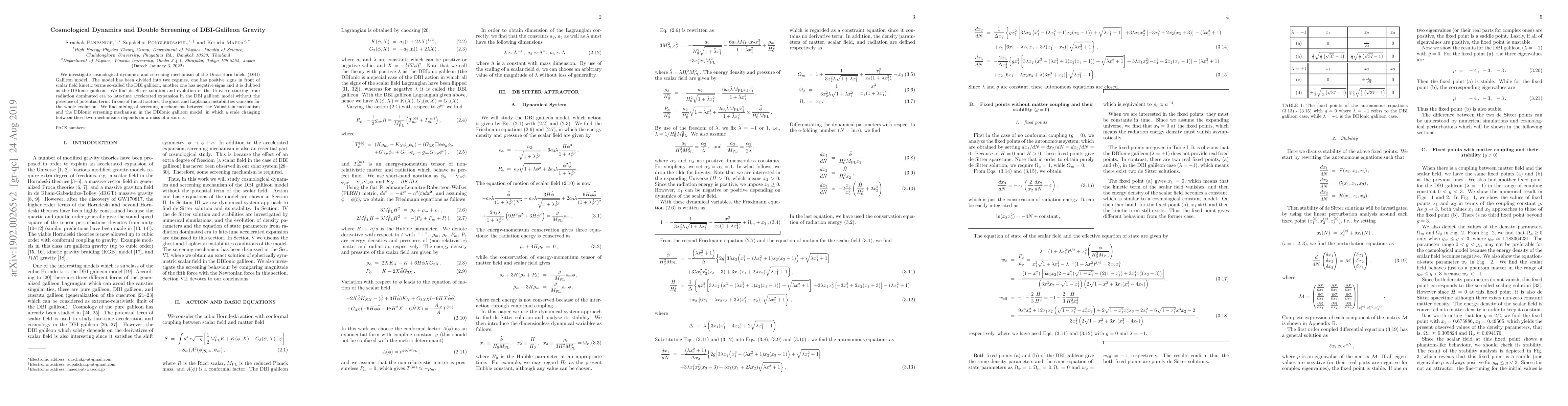 The paper presents a detailed analysis of the cosmological dynamics and screening mechanisms in DBI Galileon models, identifying stable fixed points, de Sitter solutions, and cosmological evolution without a potential term.