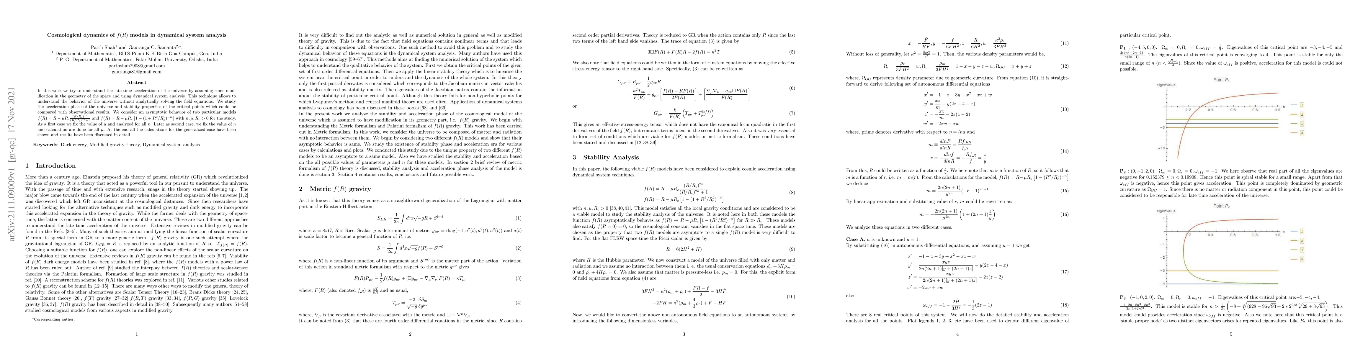 In this work we try to understand the late time acceleration of the universe by assuming some modification in the geometry of the space and using dynamical system analysis. This technique allows to understand the behavior of the universe without analytically solving the field equations. We study the acceleration phase of the universe and stability properties of the critical points which could be compared with observational results. We consider an asymptotic behavior of two particular models $f(R) = R - \mu R_{c} \frac{(R/R_c)^{2n}}{(R/R_c)^{2n} + 1}$ and $f(R) = R - \mu R_{c} \left[ 1 - (1 + R^2/R_{c}^2)^{-n} \right]$ with $n,\mu, R_c >0$ for the study. As a first case we fix the value of $\mu$ and analyzed for all $n$. Later as second case, we fix the value of $n$ and calculation are done for all $\mu$. At the end all the calculations for the generalized case have been shown and results have been discussed in detail.